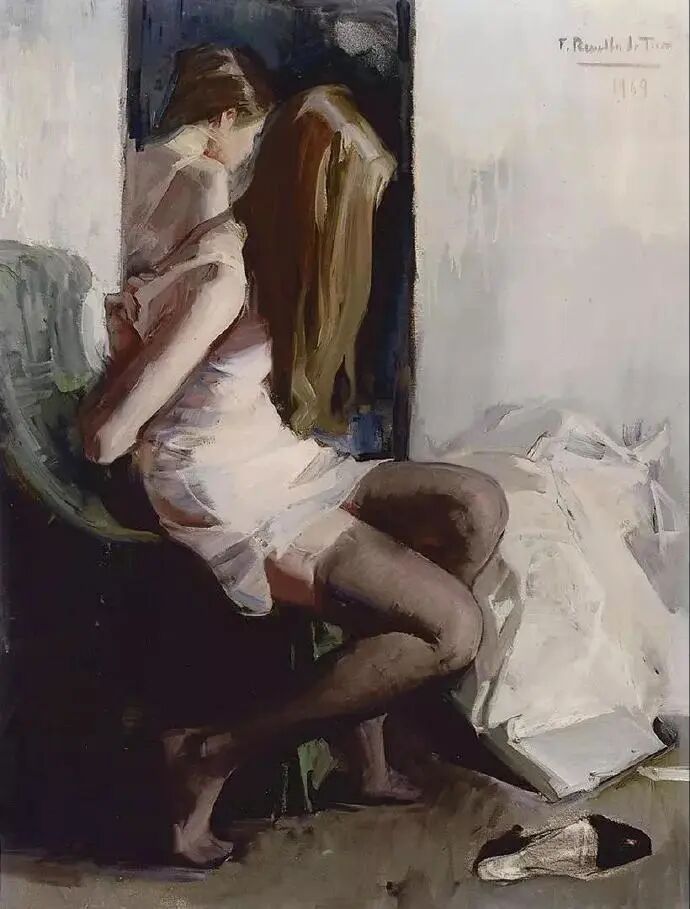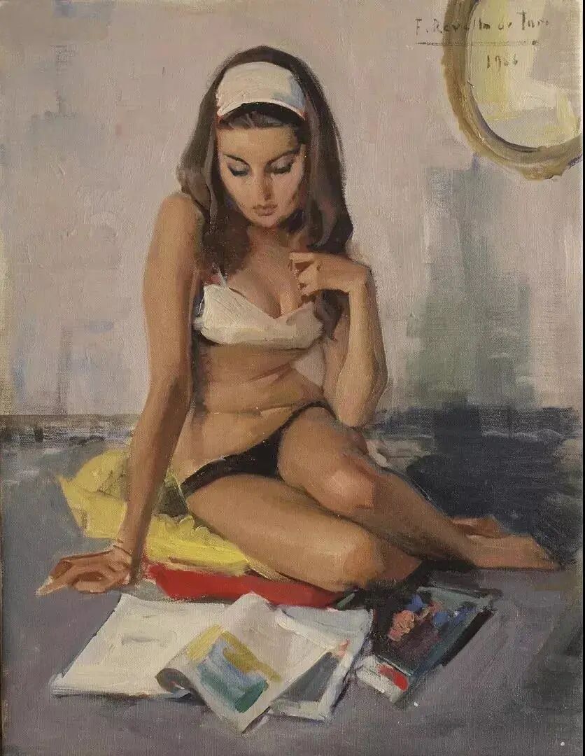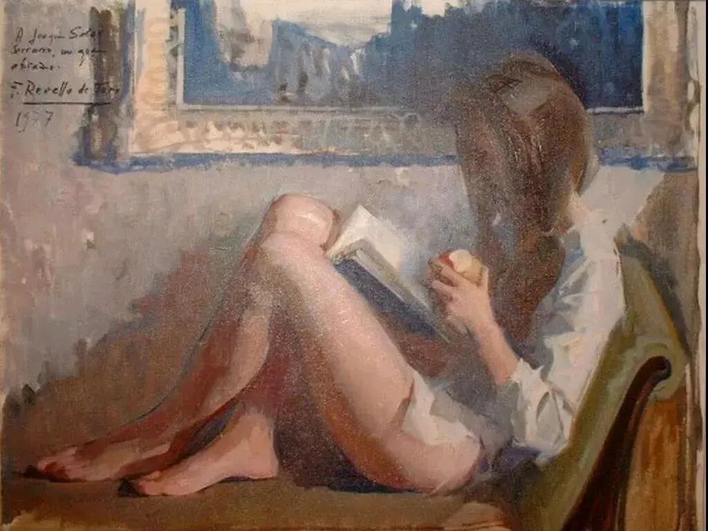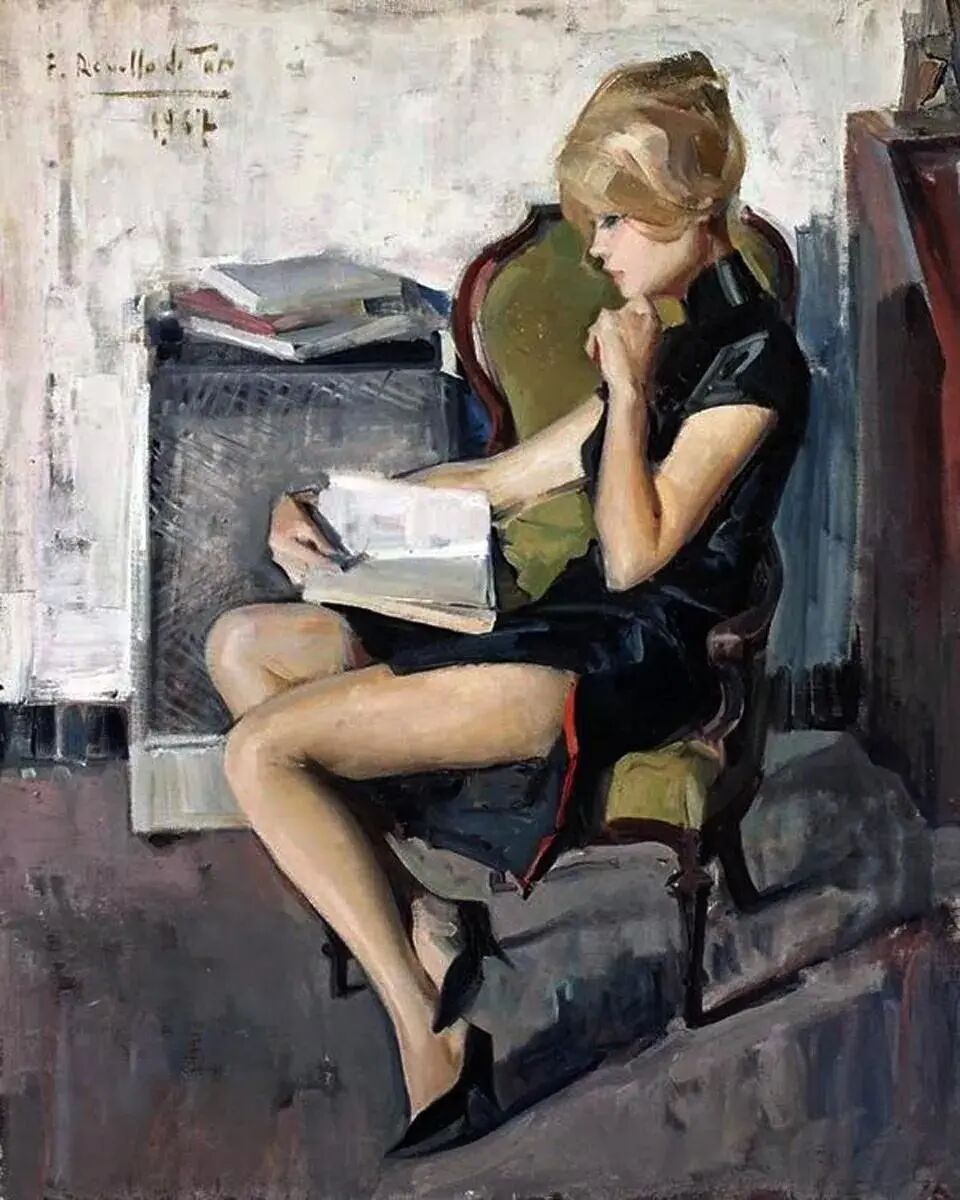 Felix Revello de Toro擅长女性人物画。因此,女人生活的各种场景也会出现在他的笔下。我们欣赏下面的画作,可以看到各种场景:有在读到远方来信的时候;有在安静阅读的时候;还有打扮穿衣服的时候,有逗弄宠物的时候……