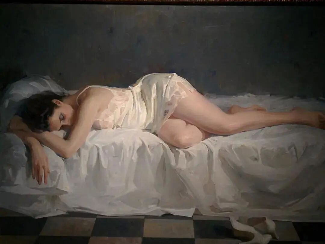 在他的女性人物画作中,很少用到浓烈的色彩,大多都是以白色、灰色为主。因为,他画作的女性给人一种朴素、纯洁的感觉,有着独特的魅力。