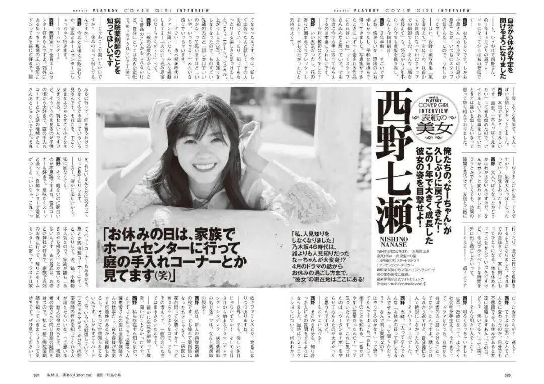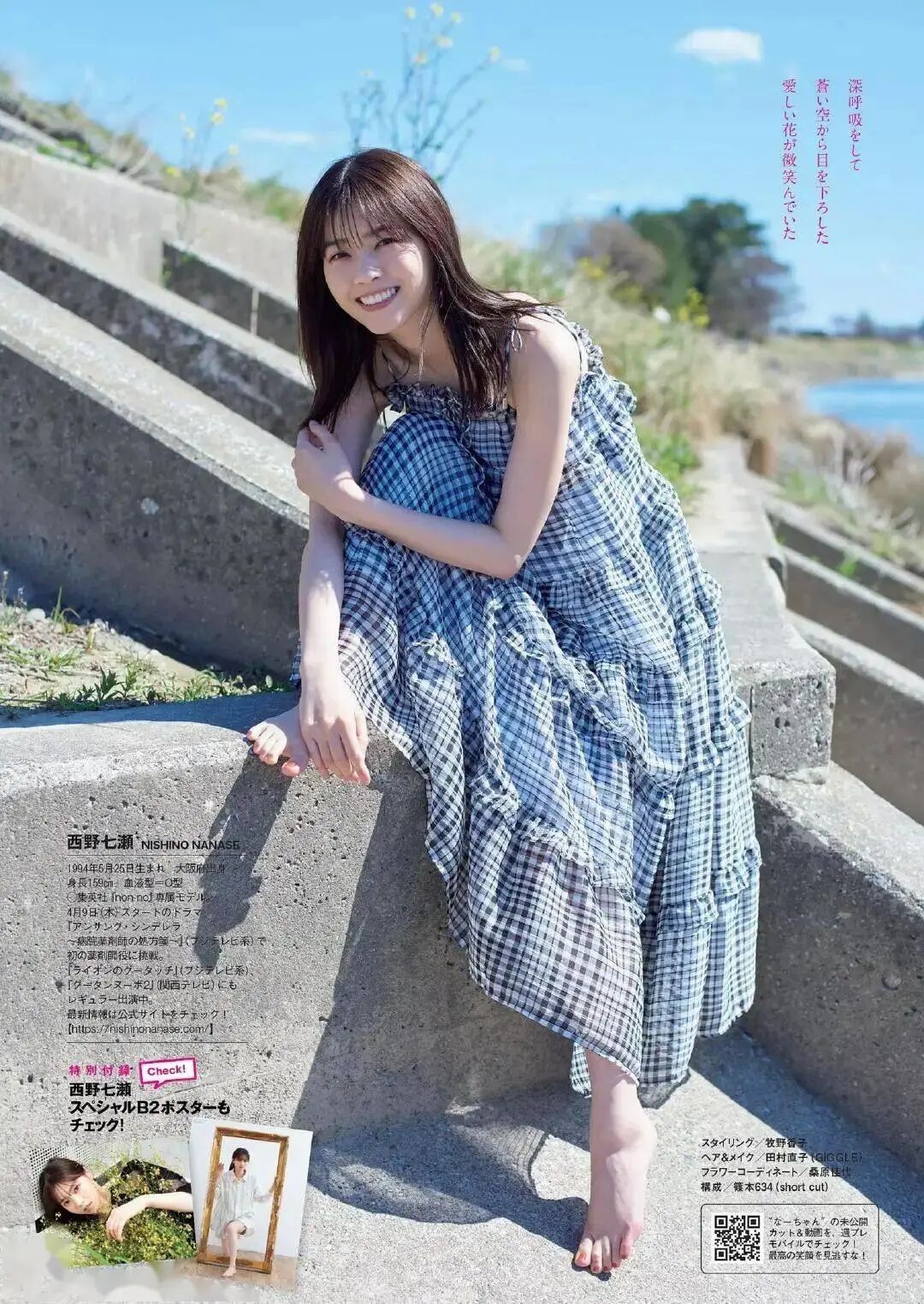 日本青春明星西野七濑(Nishino Nanase),1994年5月25日出生于日本大阪府,日本女歌手、演员、模特,原日本女子偶像组合乃木坂46成员。2011年8月,作为一期生正式加入乃木坂46。2012年2月,随组合发行第一张单曲《转转窗帘》。11月和白石麻衣一起参加“Girls Award 2012 AUTUMN / WINTER”时装秀,从而作为模特出道。2013年10月,出演个人首部电视剧《49》。2015年1月,在组合第一张专辑《透明的颜色》中发表个人首支单曲《孤身一人》。2017年9月,主演的校园片《薙刀社青春日记》播出。2018年1月,主演科幻剧《电影少女2018》。2019年4月,她因在悬疑剧《轮到你了》中饰演黑岛沙和引起了话题。
