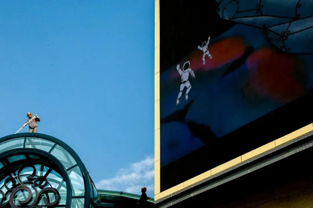 酒吧门口坐着一个白人大哥