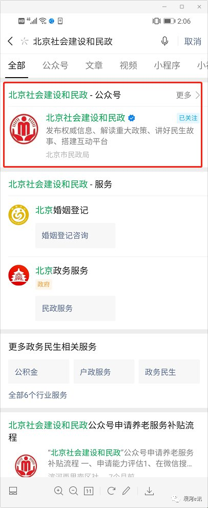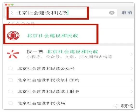 首先,大家打开手机微信,点开微信右上角放大镜一样的图标,进入微信搜索,并搜索“北京社会建设和民政”公众号;