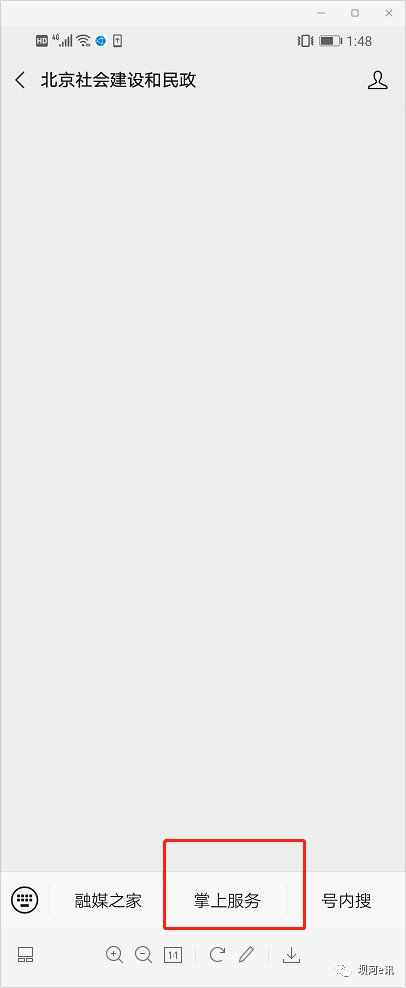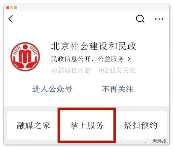 第二步:进入公众号页面内,点击菜单栏下方的“掌上服务”,进入北京民政局网上办事大厅;