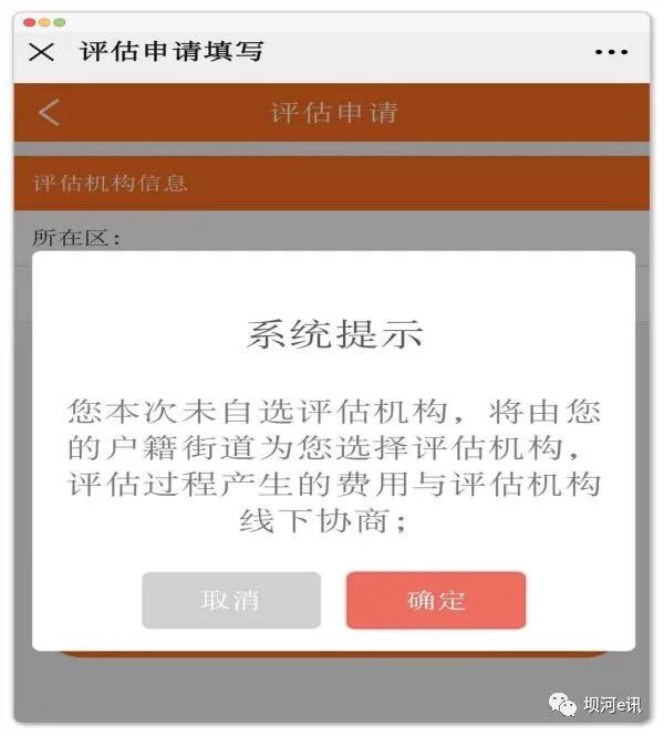 填写完申请人基本资料之后,进入选择评估机构的界面,大家如果有自己熟悉的评估机构可以搜索名字,如果没有,直接选择下一步,会出现下图的提示,请仔细阅读之后点击确定进入下一步;