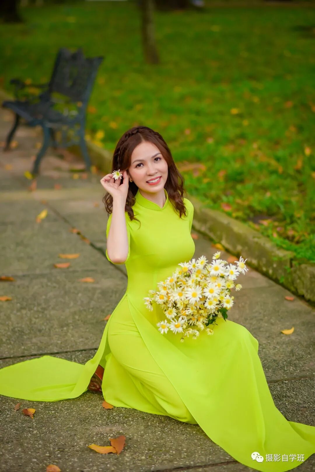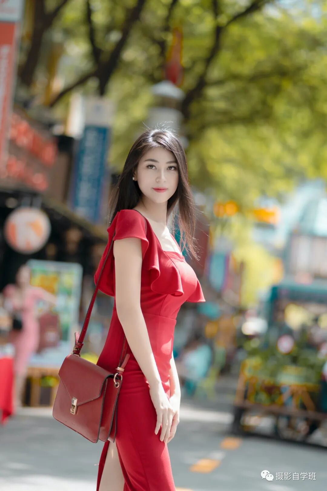 拍照的时候,不要坐到马路上,影响交通不说,也非常不安全,再美的照片,都显得不好看了。而完全可以像下图这样,在少有车辆通过的小路上,做到马路牙子上。摄影师拍摄的时候,蹲下拍,不要站着拍。并且和被拍摄的中年女性,在同一侧,顺着马路牙子拍。中年女性身前向前延伸的道路,也起到增加照片纵深感的作用。