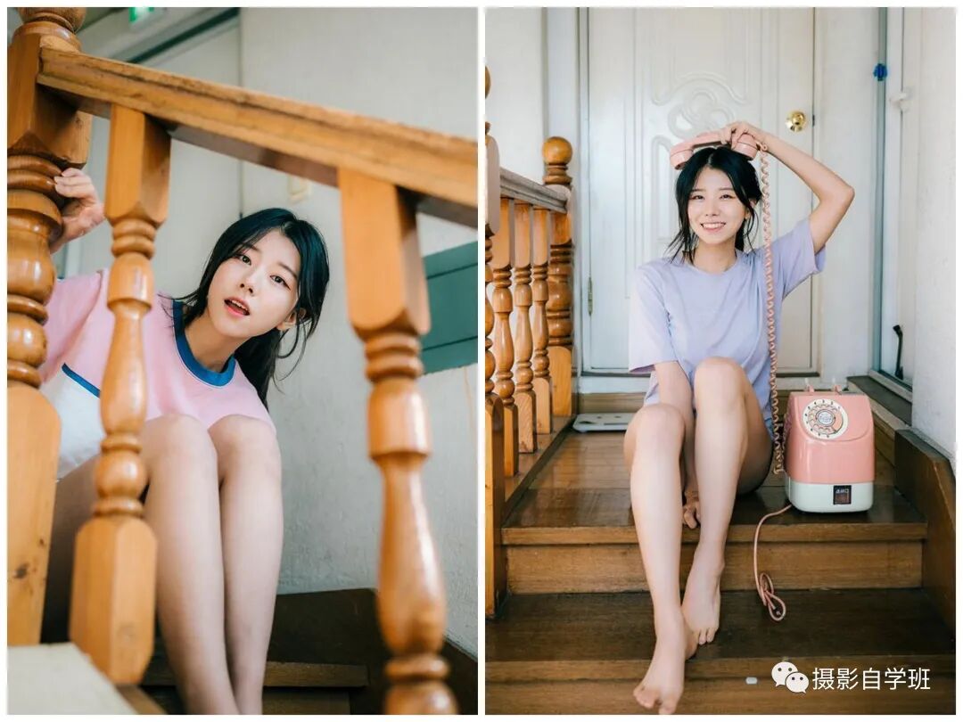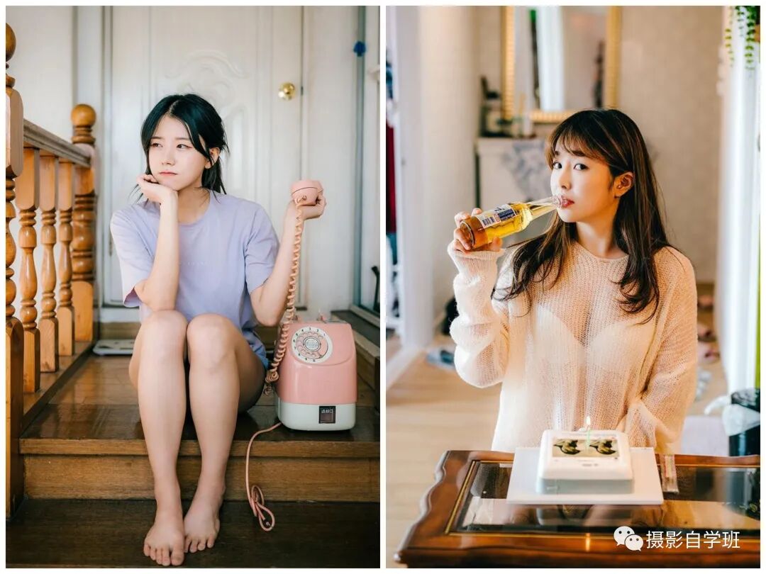 拍摄人像的时候,可以使用道具,但是注意,不要让道具太出戏,比如上图左侧这张电话就很出戏,如果不是为了拍照,谁也不会把电话放在楼梯上。道具太出戏,这是拍摄人像的大忌。而右侧这张人手中举着饮料或者啤酒,看起来就更自然真实一点,不那么做作。
