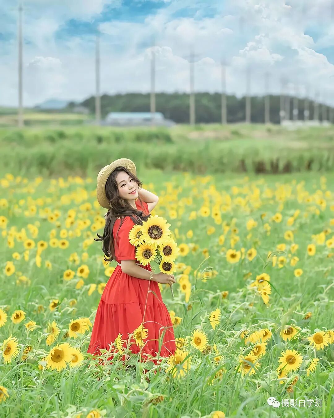 在花海拍摄的时候,我们可以像下图这样,怀中抱着几朵花,适当抬头,把一只手放到眼睛前方,做起瞭望的动作。也可以像下图这样,拿着一束花,做出回眸的姿势。
