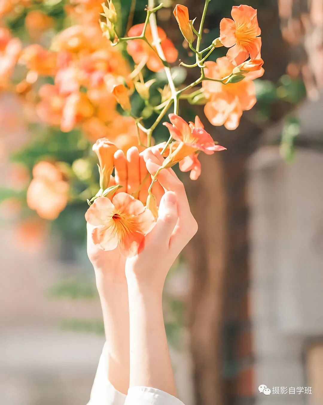 拍摄人像照片的时候,也不要忘记拍一些细节,比如我们可以拍摄上图这样,人扶着花,也可以拍摄下图这样,只留着手,不显示出人的身体和头部。