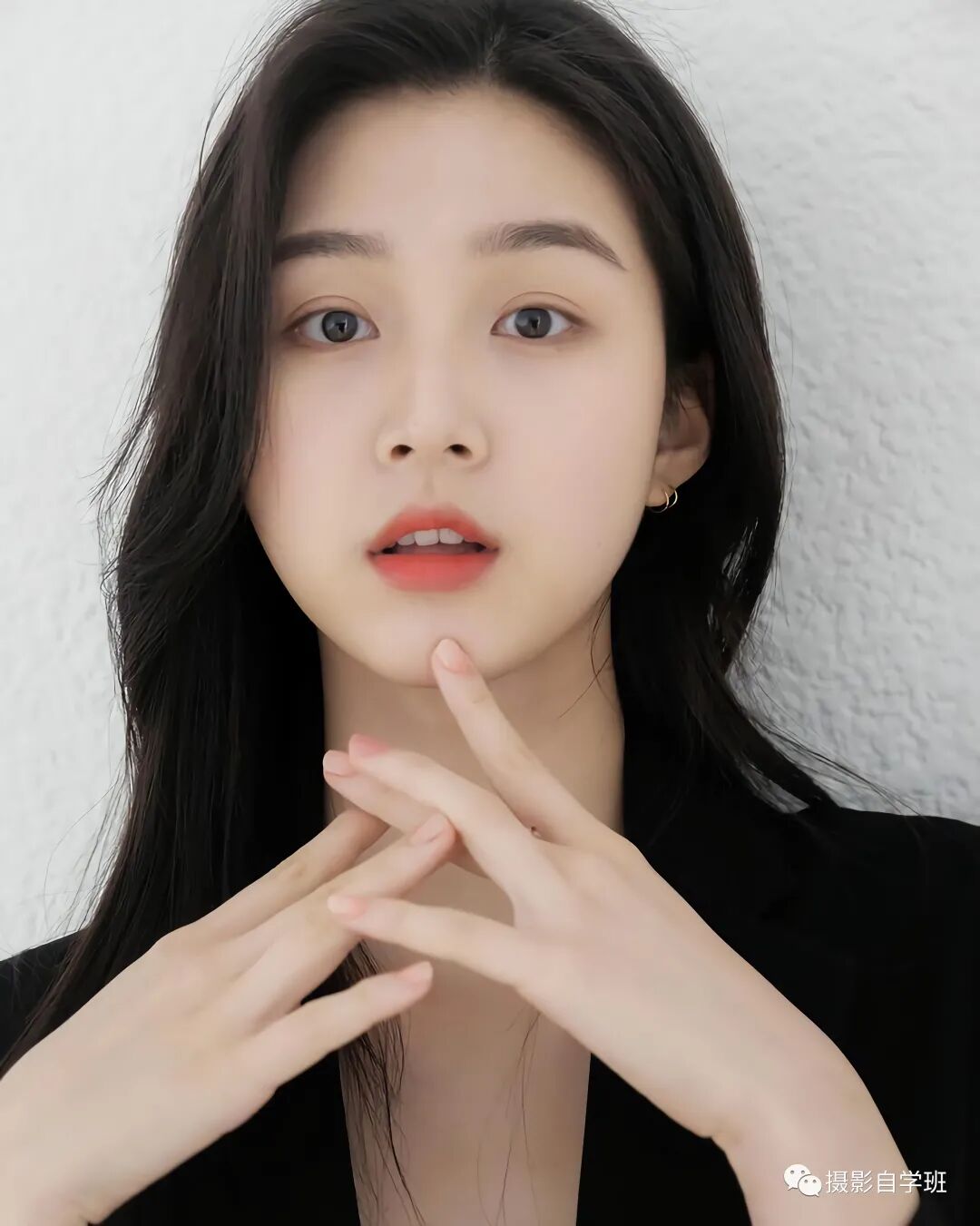 很多朋友拍照的时候,手不知道应该放在哪里,我们可以像上图这样,将两个手放到眼睛前面,目光注视着手就可以了,或者像下图这样,两个手的手指打开,交叉放在下巴下面,这两个手部的姿势都很漂亮,你可以试着模仿一下。