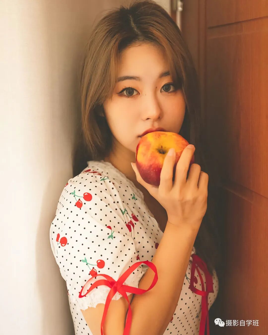 在家中墙角,也可以拍出好看的照片,摆姿也非常简单,可以像上图和下图这样,拿一个苹果在手中,可以看向镜头,或者看向地面,姿势就摆出来了。