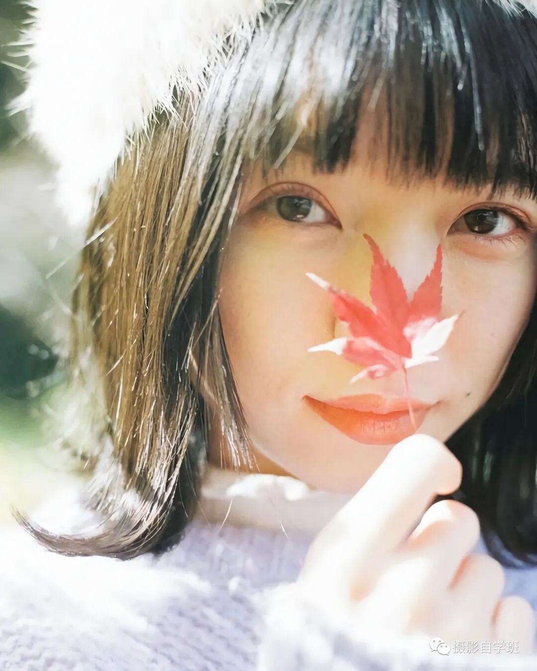 在拍照的时候,要学会使用道具,它可以让你的姿势更加丰富多彩,比如像上图这样,用一朵花挡在嘴的附近,增加照片的亮点,或者像下图这样,使用一个枫叶,放在鼻子附近,也起到很好的点缀作用,有道具可以让你拍摄时不尴尬。