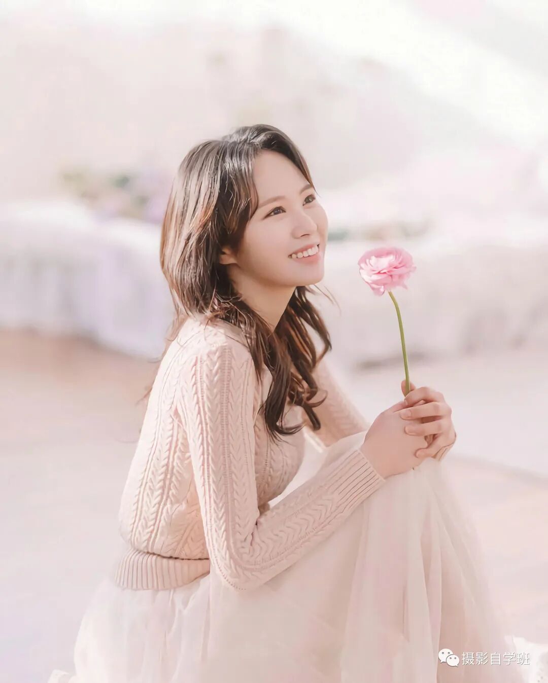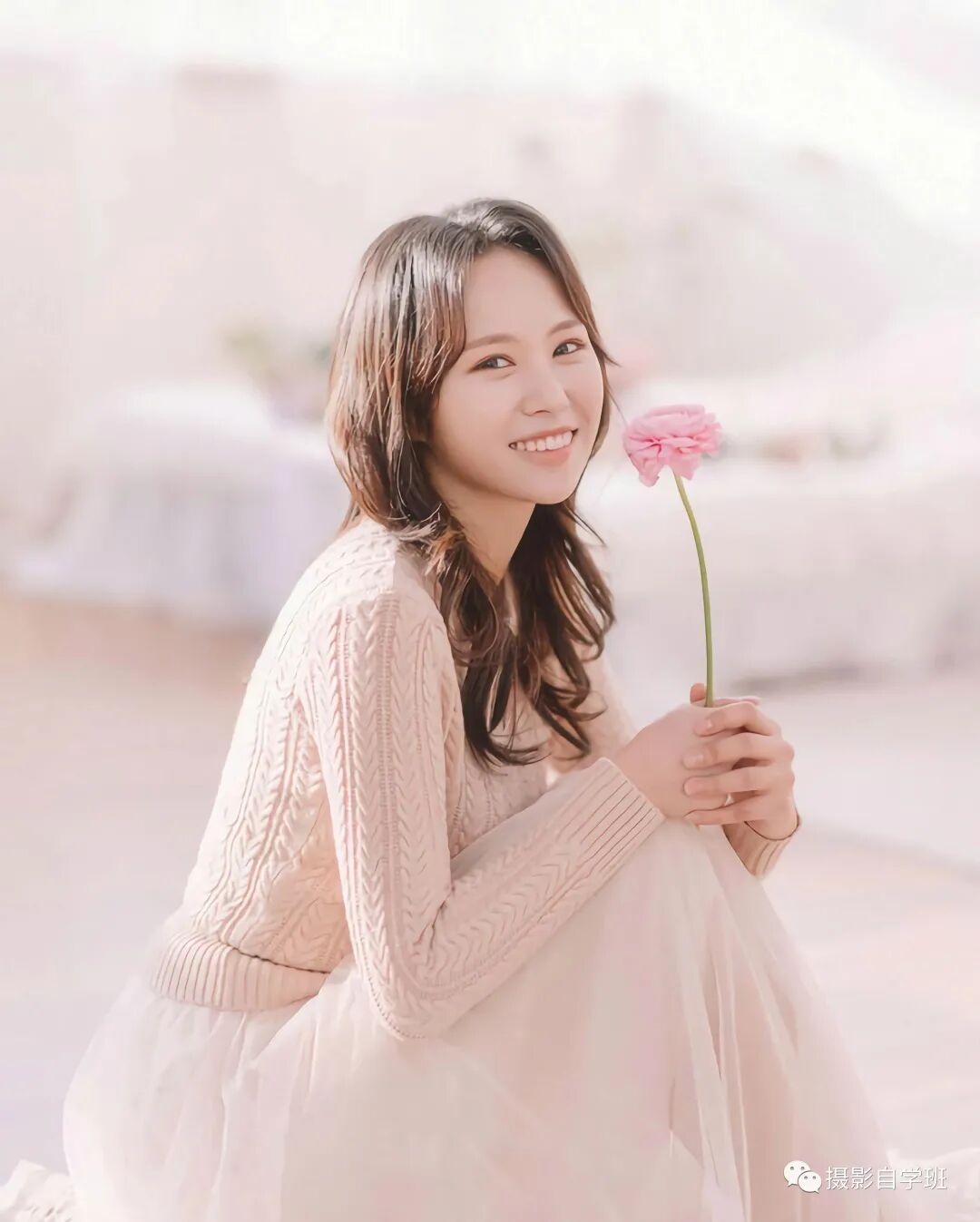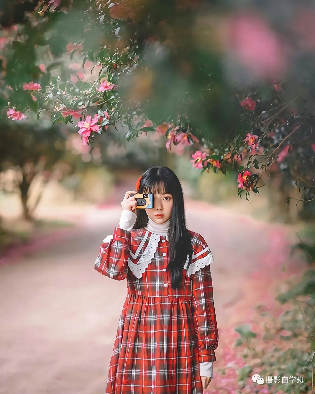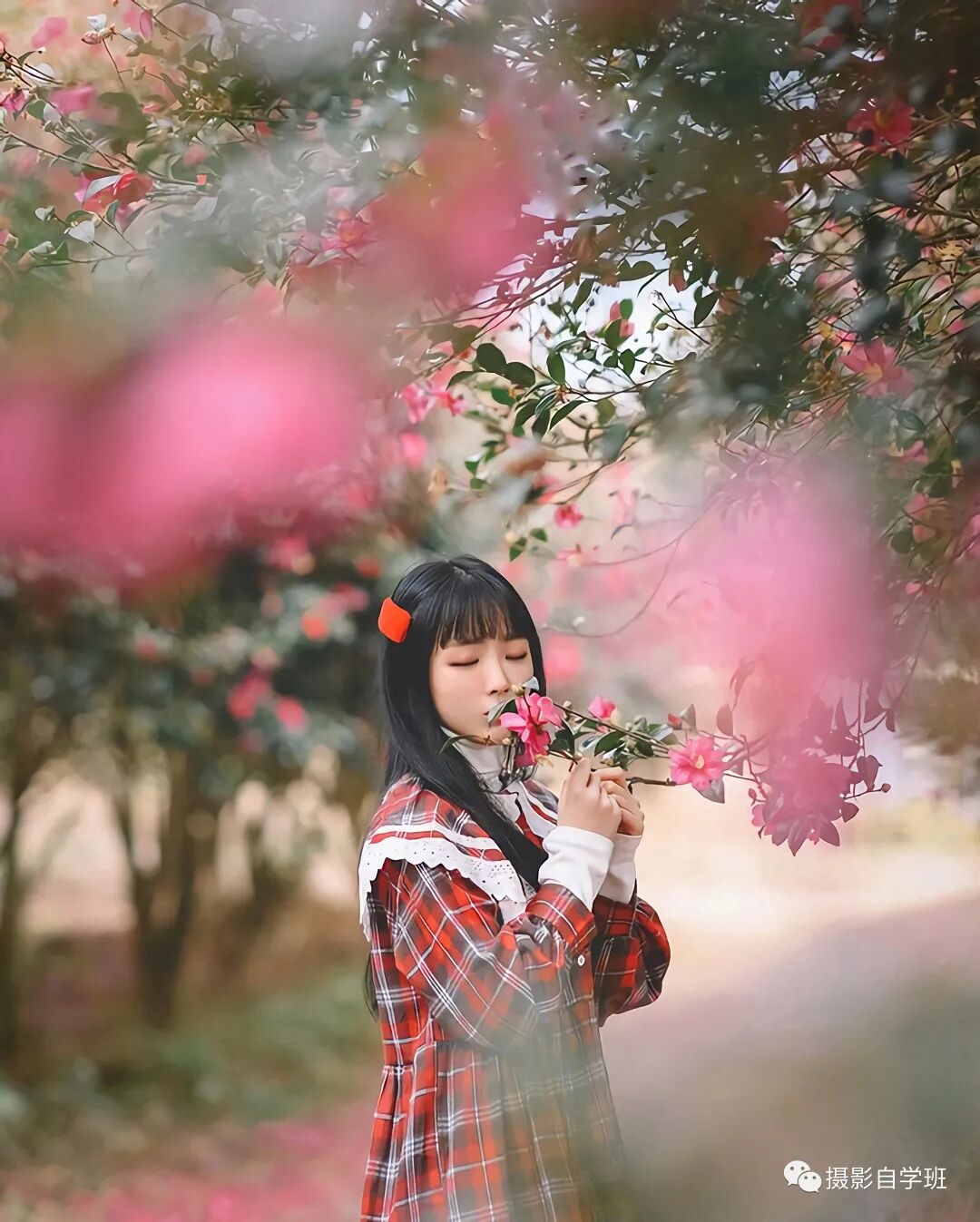 在人像摄影当中,有些时候需要摆出姿势,在摆姿的时候,不要太刻意,不要太假,比如上面这张照片,拿着相机面对镜头,眼睛睁得很大,看起来就很“突兀”,不如下面这张,把花伸到鼻子前,做出嗅花的动作,闭着眼睛,更加放松,惬意自然。