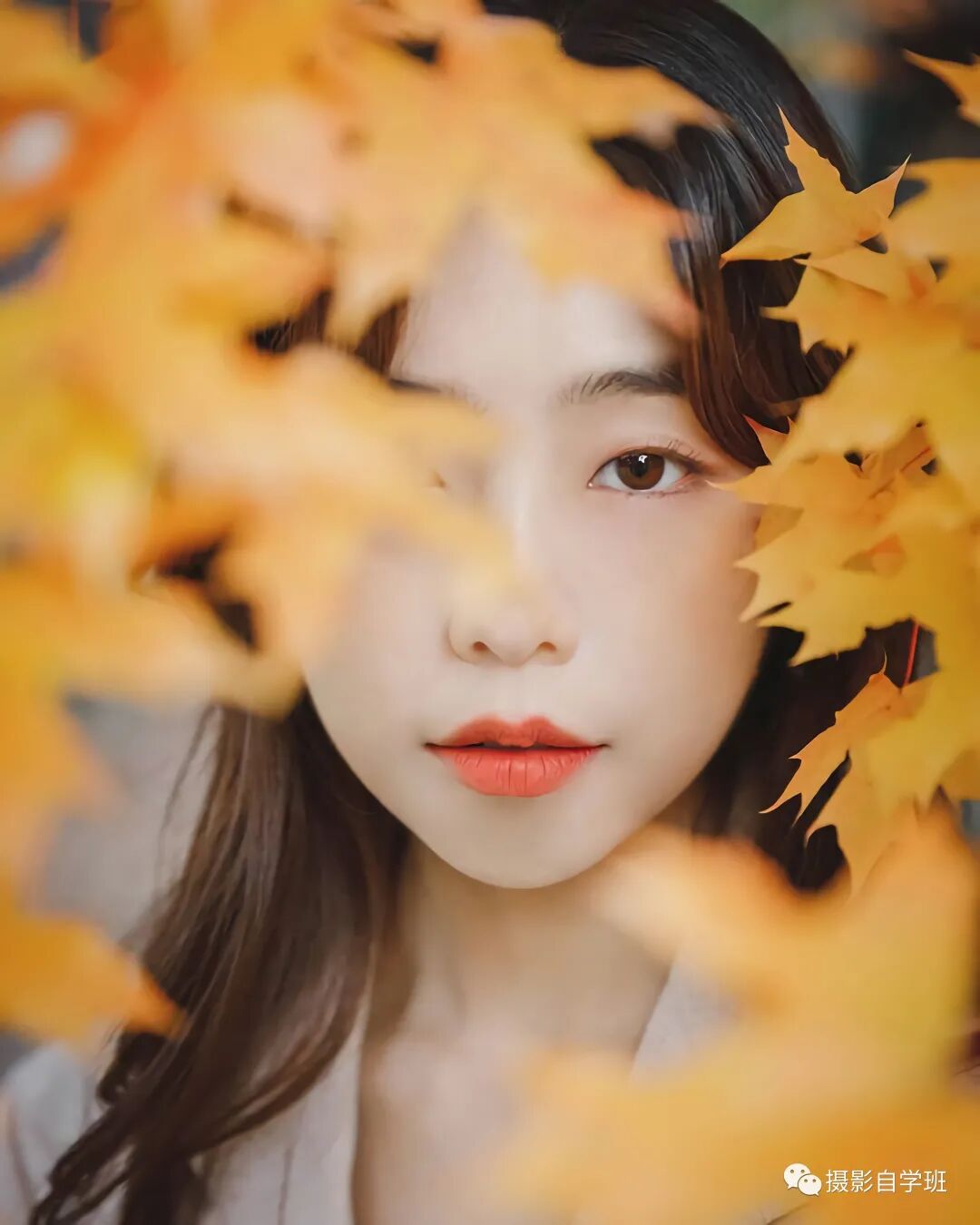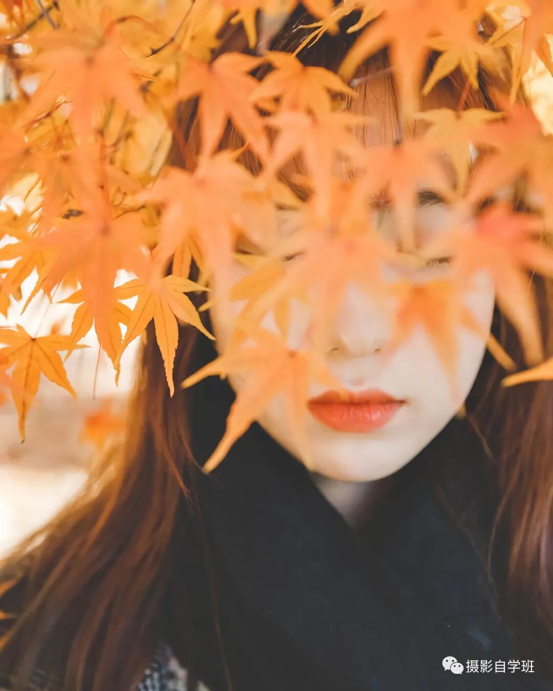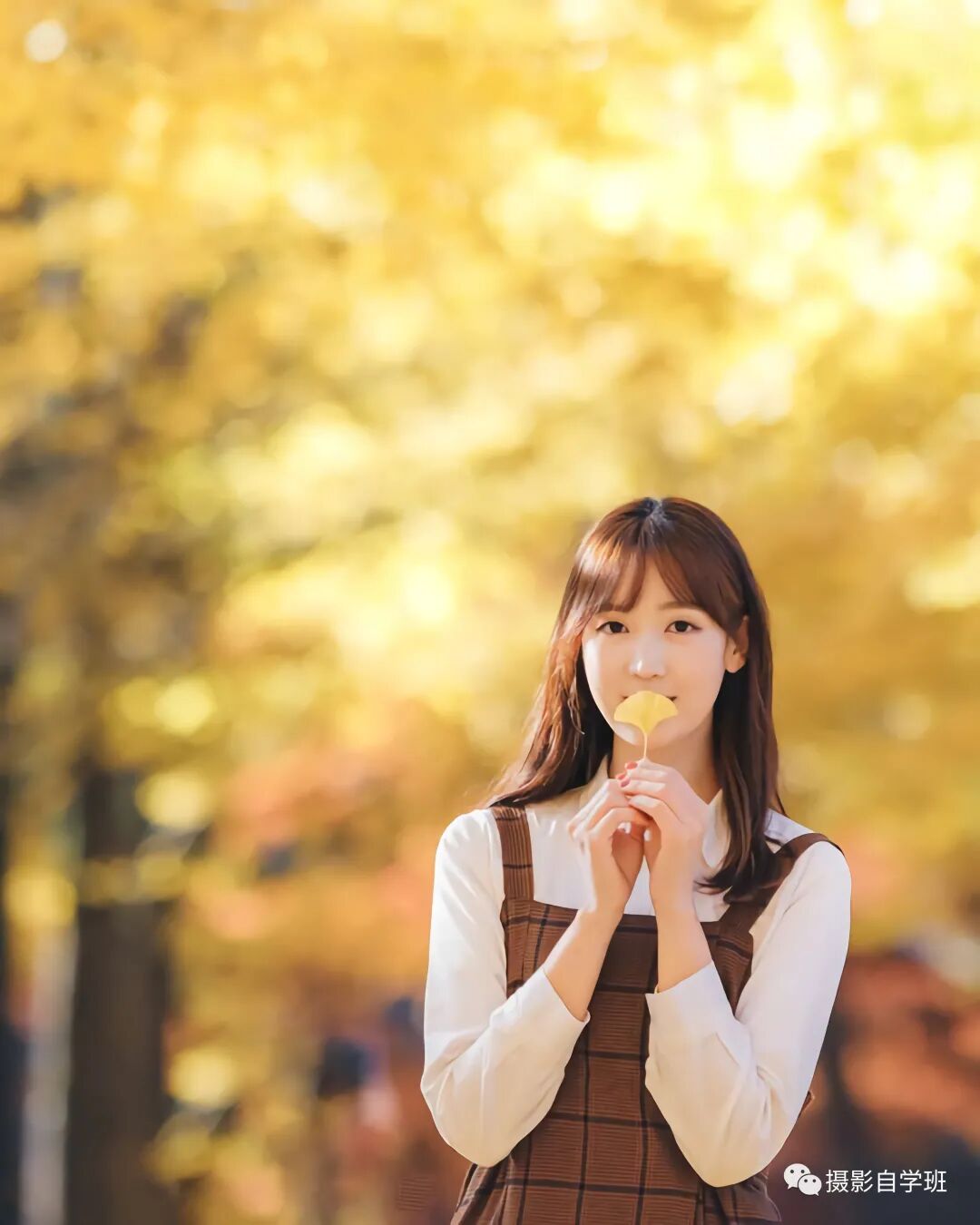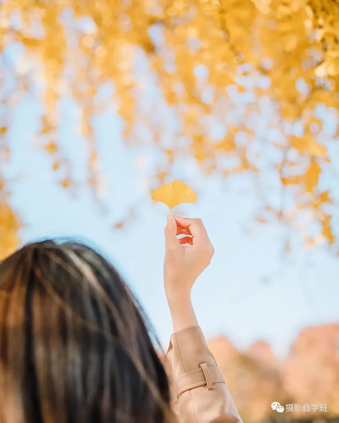 拍背影,也可以,但是不要向上图一样,拍个脑袋。在摄影当中,一定要合理地取舍,比如上面这张照片,背景的黄叶虽然很漂亮,拍背影也可以,但是不要只像上图一样,只拍个脑袋。虽然对焦在手中的树叶上了,但是树叶很小,人的脑袋很大,在左下角,很分散观者的注意力。倒不如像下图这样,拍个正面的镜头,人拿树叶,放在嘴巴上,利用好这个漂亮的背景,照片就很漂亮了。