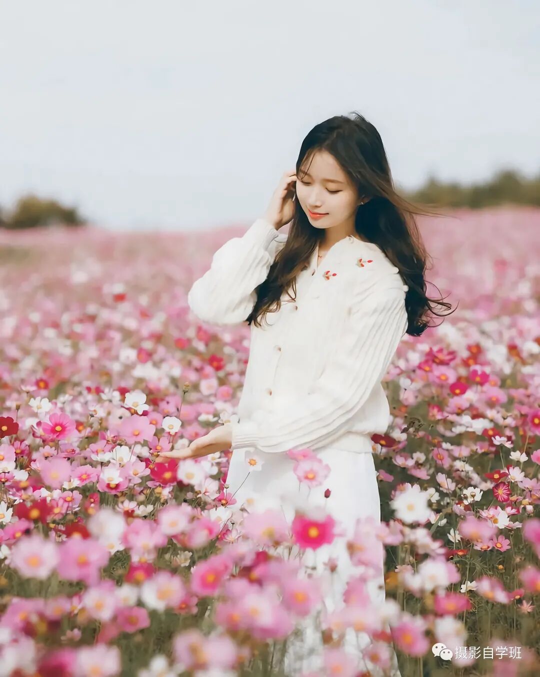 除了避开背景过曝或者过暗以外,还要注意,避开背景的线条,比如上面这张照片,背景有线条,正好穿着人的脑袋而过,这是拍摄人像的大忌。那在这种花海中,摄影师可以带个凳子,站到凳子上,从上往下俯拍,这样背景就是一片花海,就可以完美地避开切头的线条了。