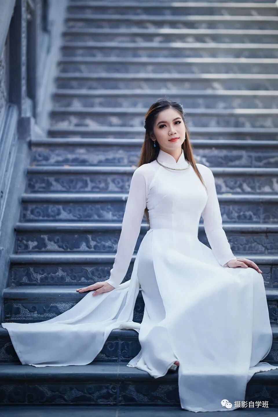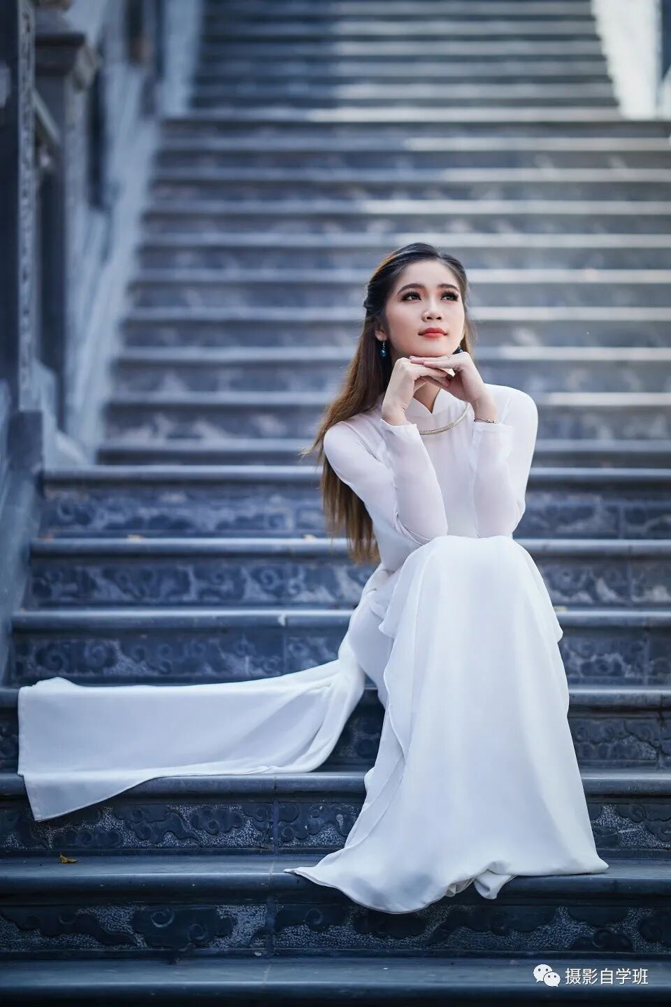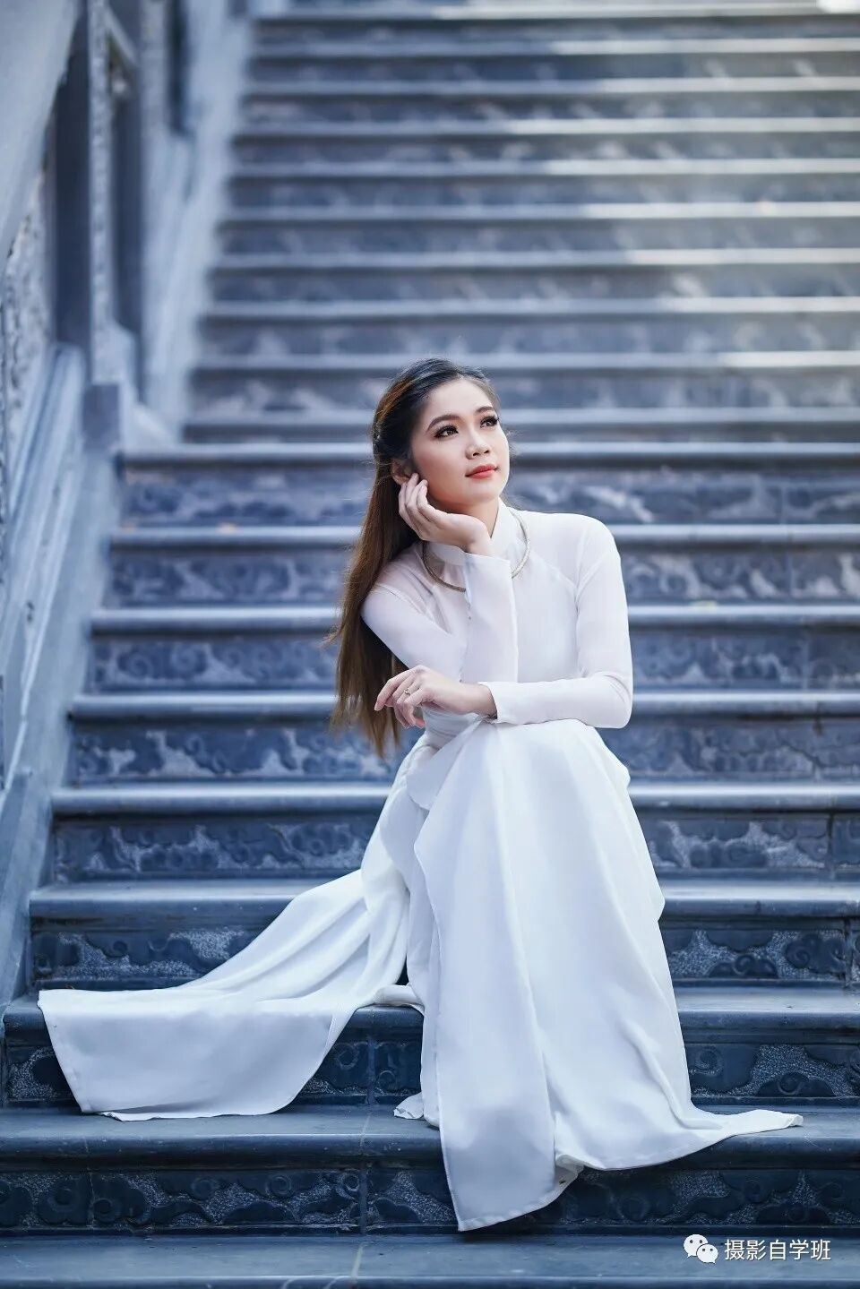 当人坐在台阶上时,面向镜头,手放在下方,像上图这样,看起来很僵硬。倒不如像下图一样,让女士把两个手,都拄在头下,更加自然得体。