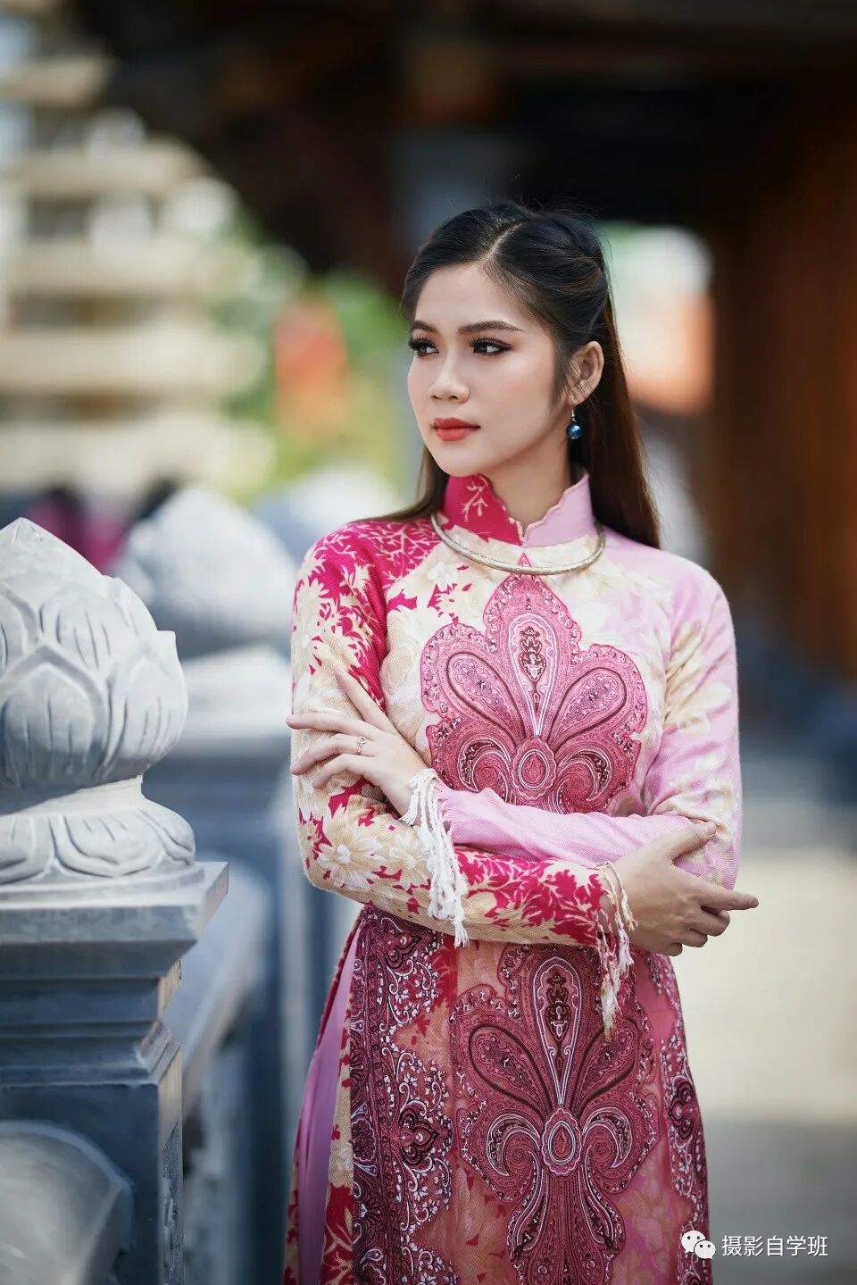 上面这张照片,穿着妆容以及周围的环境都不错,但是还有一个小瑕疵,女士的右手悬空放置,让人感觉很尴尬,没有着落。我们拍摄时也要注意避免这种错误,可以让女士像下张图一样,双手抱在胸前。