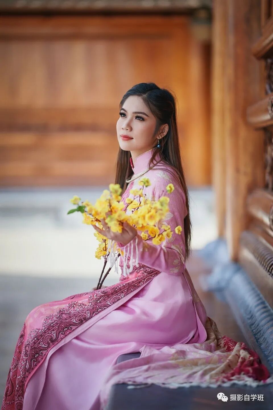 如果使用围巾作为道具,一定不要像上图一样,围在脑袋上,显得很乱,不漂亮。而是可以像下图一样,把围巾搭在手臂上,眼睛看向别处,看起来更加端庄贤淑。