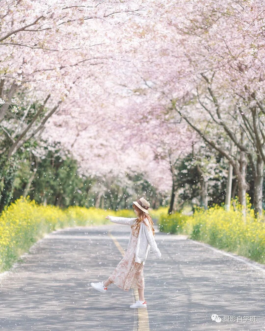 人像摄影当中,我们可以摆出很多不同的姿势,什么样的姿势,可以看起来更文艺呢,那就是“矫揉造作”一些,比如在空旷没有车的路上,有花瓣飘落,那做出上图这样,迈开大步的姿势,就能让照片更文艺,在路上拍照,安全是第1位的,也不要影响交通。如果在春天,采用这种姿势拍摄,一定要找到有花的路,一定要等风,把花瓣吹落,再按一下快门,效果就会更好了。