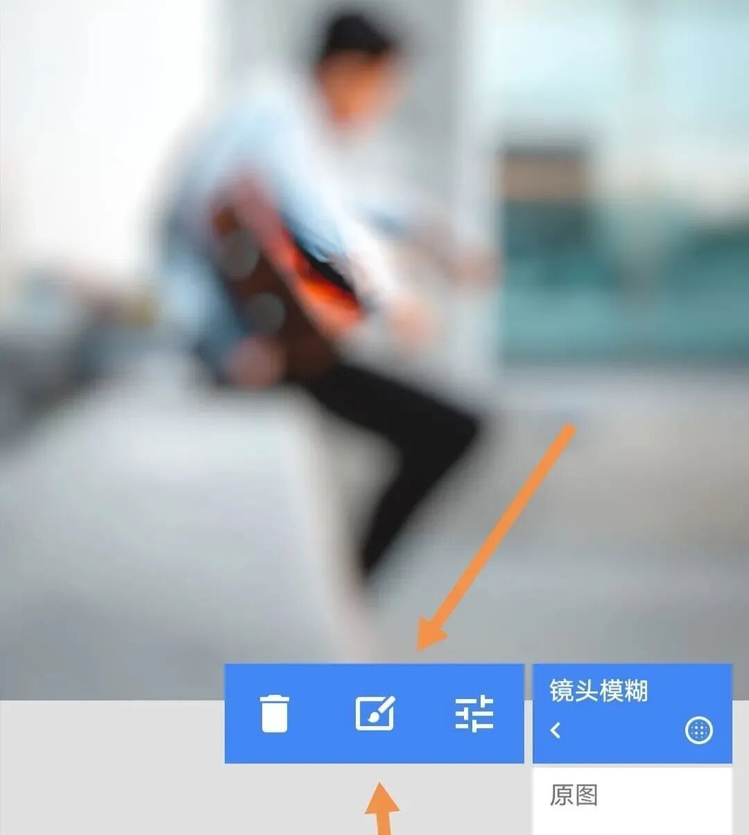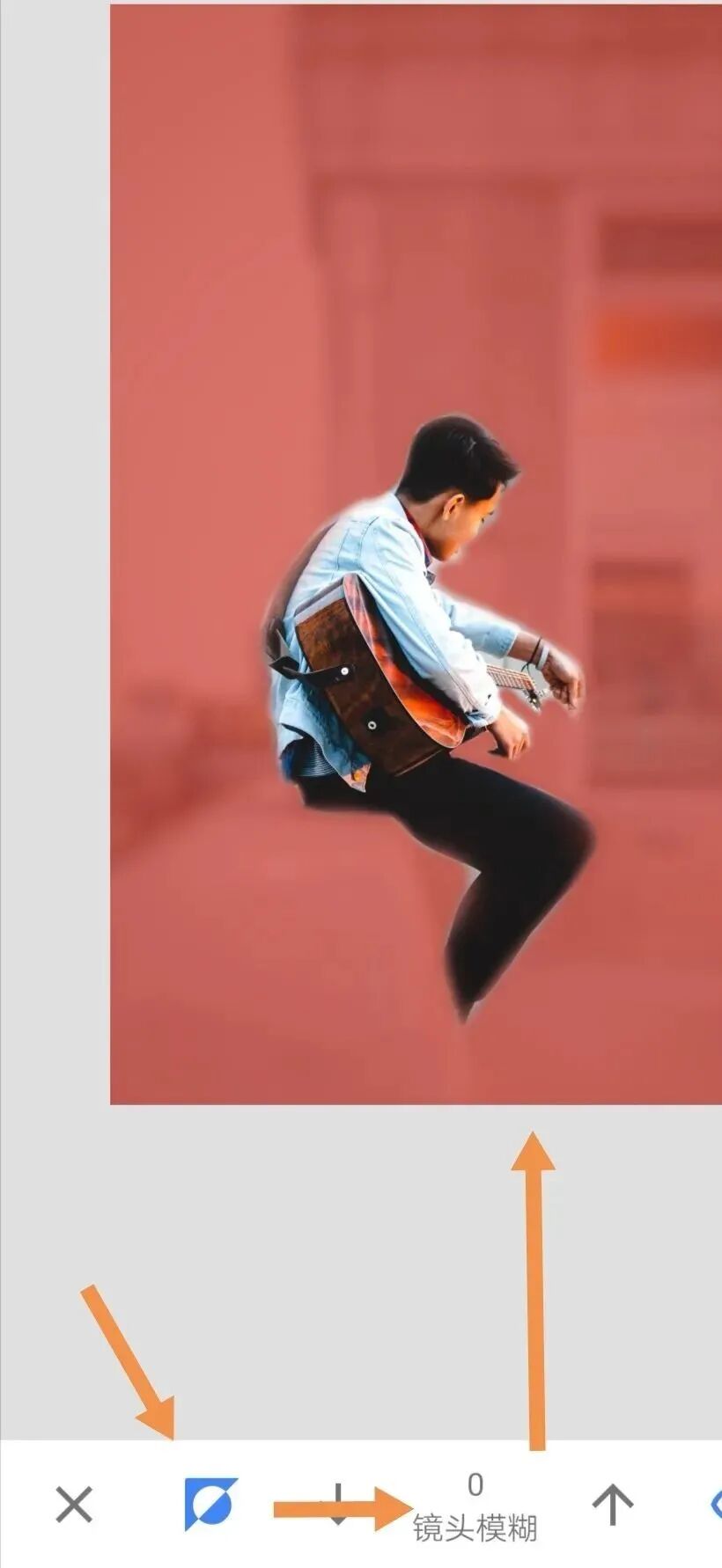 (4)通过蒙板把主体人物修出来。 点击右上角弯曲的箭头,查看修改内容,右侧出现镜头模糊,点击它中间的画笔,进入模糊这一步的蒙版。