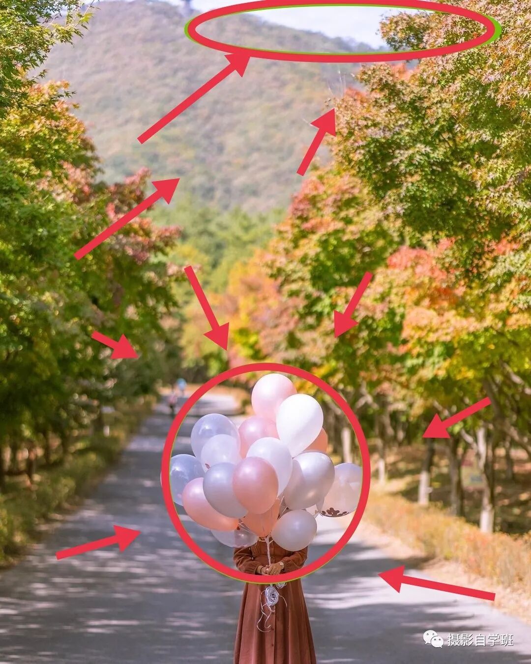 这张照片,除了气球挡脸以外,背景当中,也有很多瑕疵,尤其照片上方天空,与山之间的缝隙,因为两者颜色有差别,就会让背景,看起来比较乱,而我们拍摄的时候,完全可以像下面这张图一样,适当缩小画面的范围,从而减少背景当中,杂乱的部分,并且也让气球升起来,把人的脸露出来。