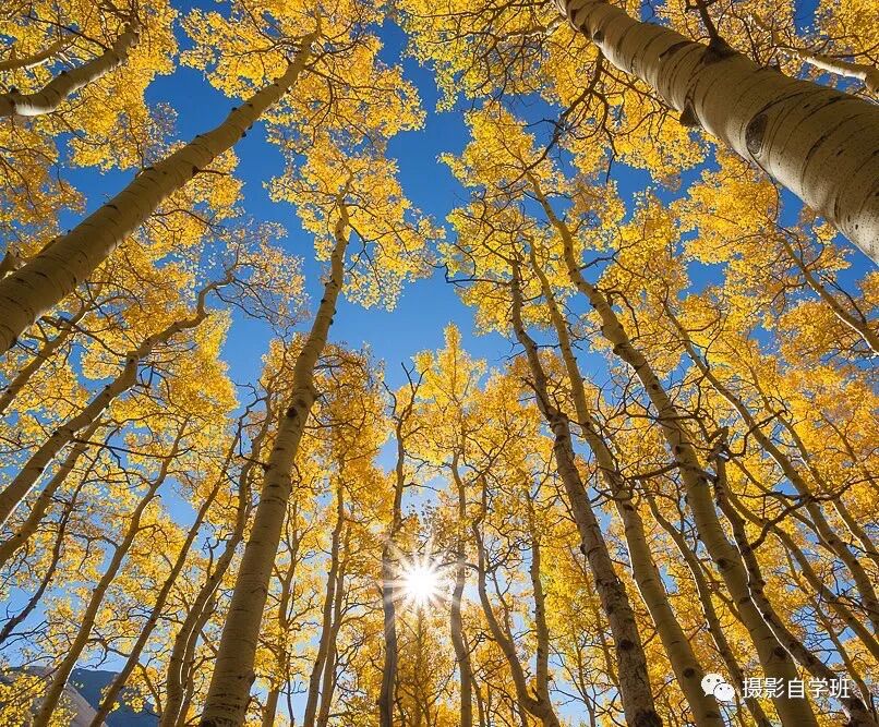 因为仰拍顺着树干,树干直插天空,更能体现照片的穿透力与冲击力,如果想拍出上图这样的星芒效果,单反需要使用小光圈,手机拍摄的话,需要使用星芒镜头。或者在镜头上横竖磨两下,能出现4个角的星星。