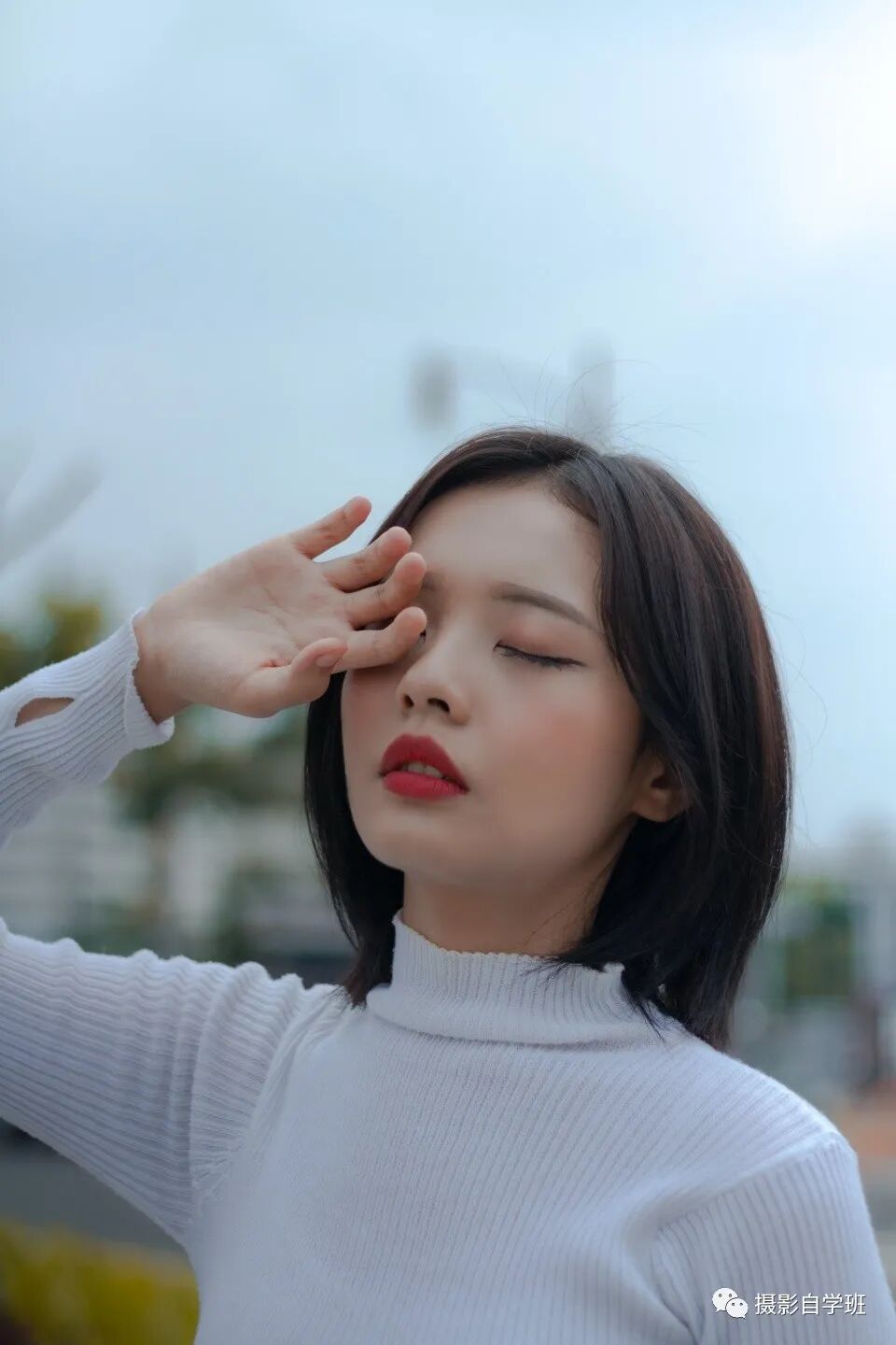 很多朋友被拍摄时虽然有姿势,但是不敢面对镜头,或者羞于面对镜头,那么就可以像上图这样把眼睛闭起来了。上图错误在于,照片太满,人物的头部顶到照片的上边缘了。我们可以像下图这样采用竖向拍摄,让人头部上方,有一定空间,照片更显宽松舒服。