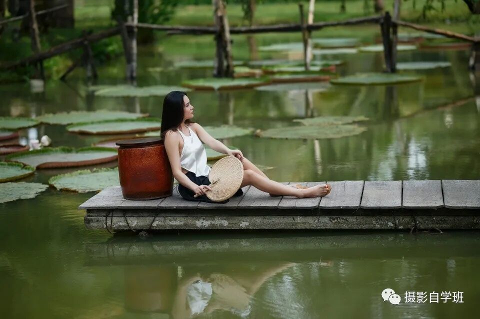 姿势摆出来了,但是拍摄时一定要注意,我们拍摄的是人,所以一定要让人的脸看清,或者至少是侧脸,上图首先人物太过小了,并且脸转的太过,冲镜头的方向面积太小。同样是坐在木排上,姿势与周围环境相呼应就可以,拍摄时要让人的脸被凸显出来,至少被看清了。