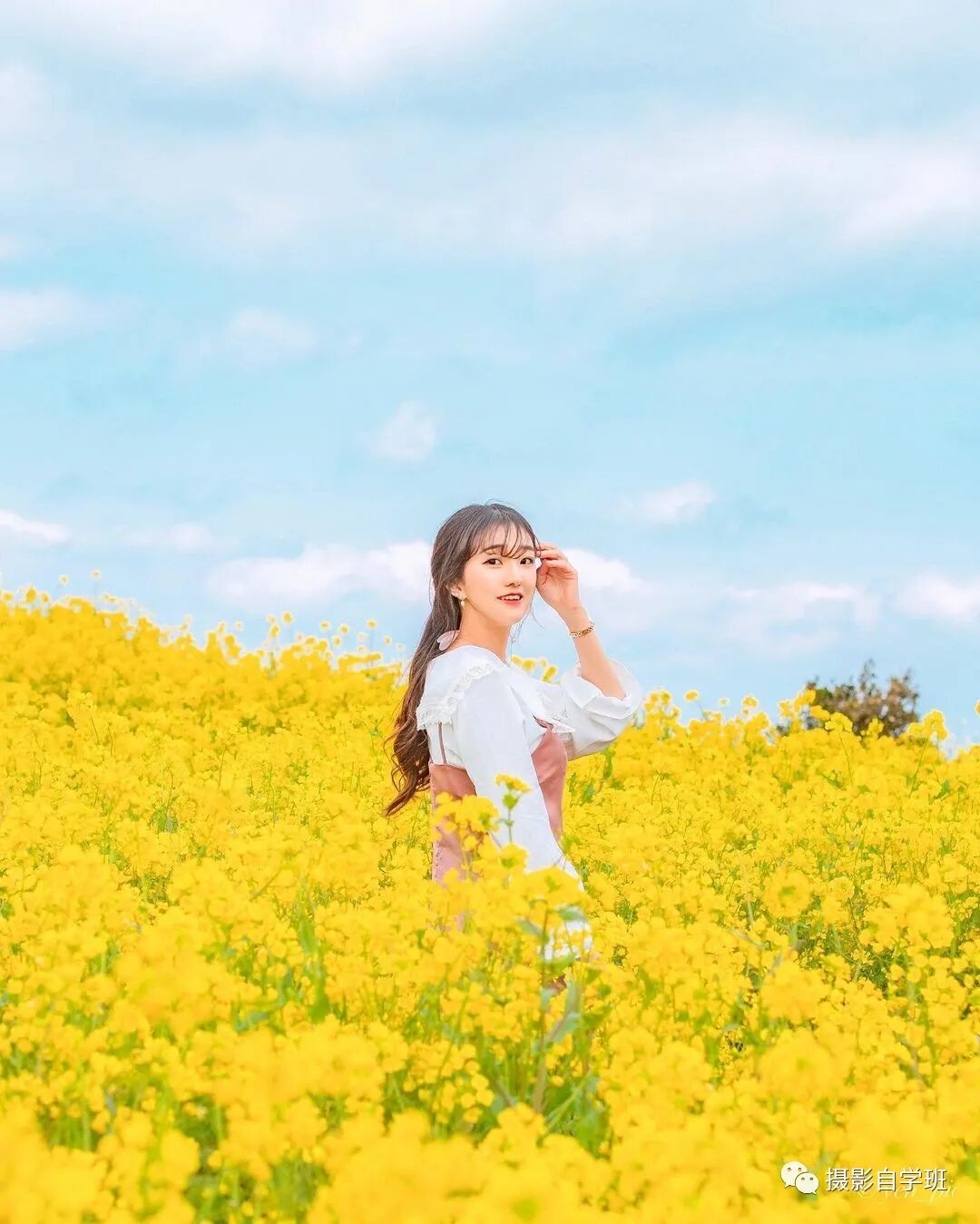 花海很漂亮,但人直直地面对镜头,看起来就会非常呆板。你在花海当中摆姿势的时候,一定要避免。改正方法是,可以参考下面这样的姿势,扭动身体,做一个回眸,另外一只手抬起来,放在眉毛附近,这样就更加自然,不至于太呆板。摆姿势的时候,不想有太大动作怎么办?