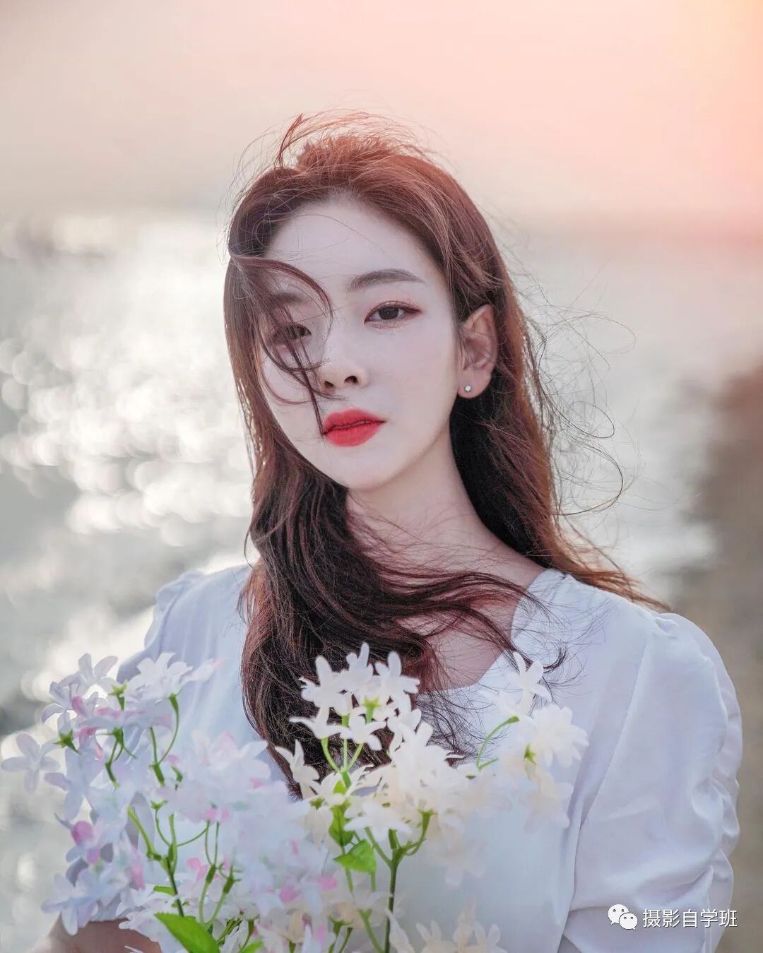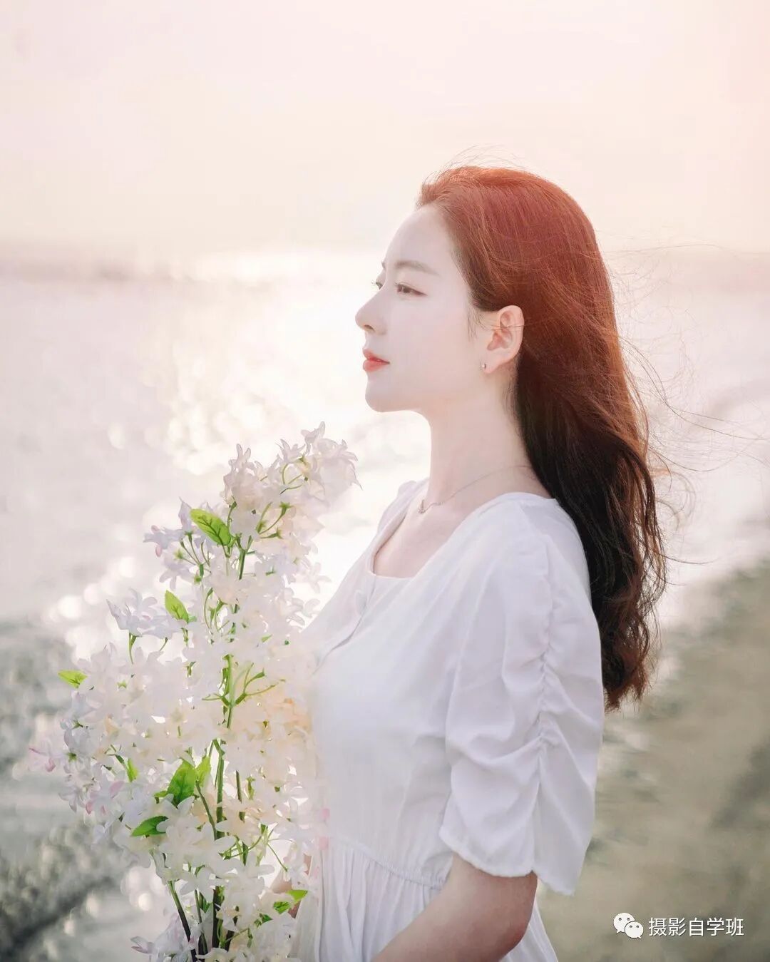 不看镜头注视远方,身前拿着一束花,姿势很优美,同时还要注意,最好是在清晨或者傍晚拍摄,整体环境当中,有非常柔和的光线,色彩也非常漂亮,会让照片。氛围也非常优美,配合上优美的姿势,才能成就一张优美的照片。