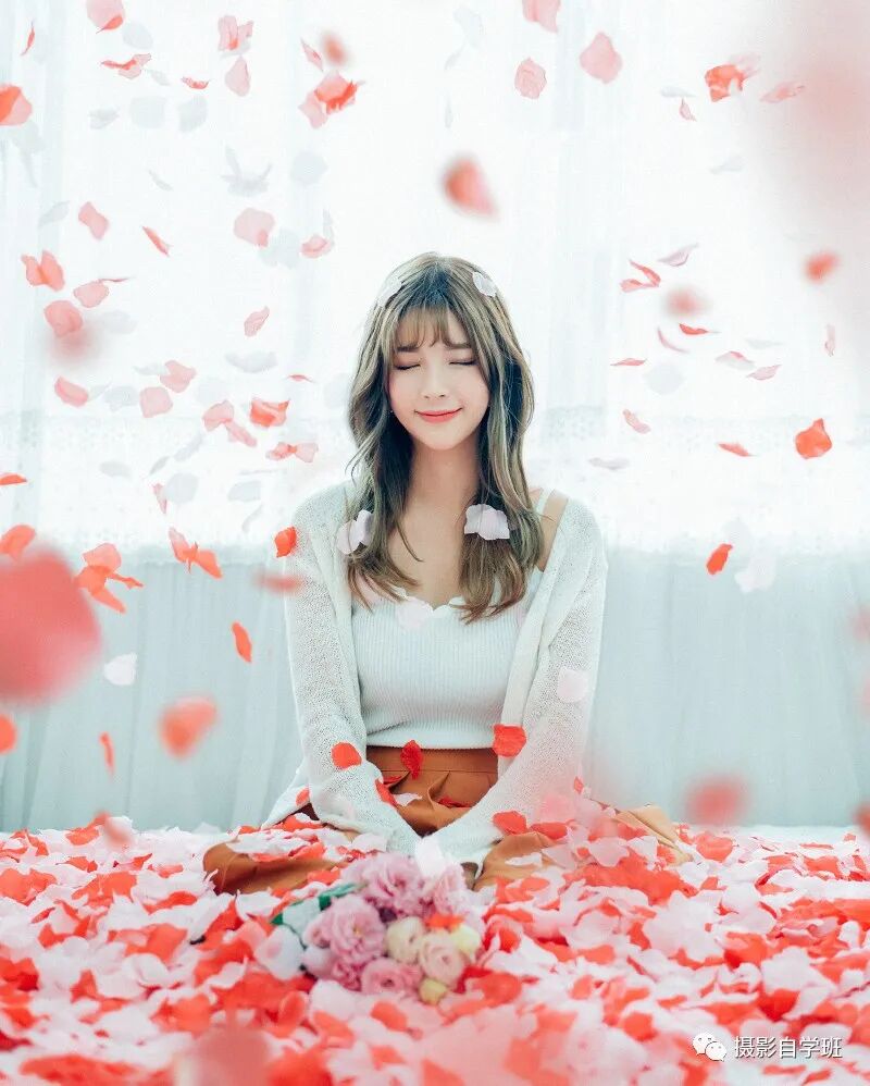 如果家中有反光板,那完全可以让人,坐在窗户前,利用反光板,来给人的面部进行补光,但是这种情况下,背景容易过曝,如果背景是白的一大片,就不那么好看了。所以,可以像下面这张照片一样,准备一些假花瓣,扬起在空中,背景就会有细碎的花瓣,而不是白的一片了。花瓣结合上白沙帘,照片优雅有韵味。