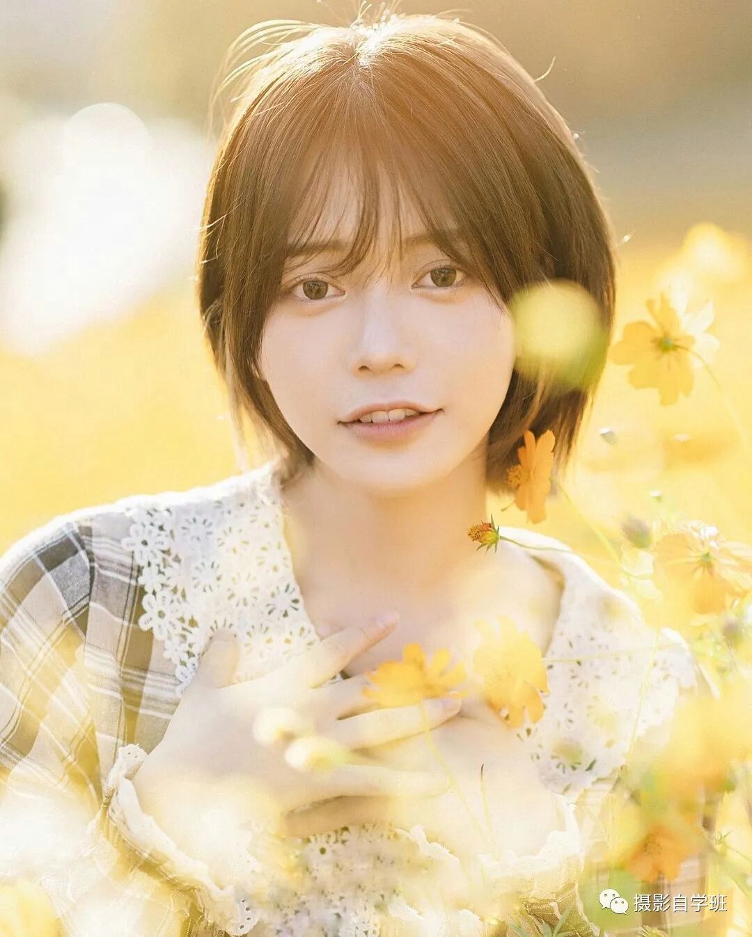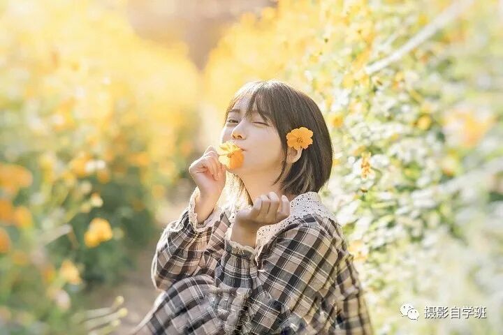 在春天,拍摄半身照片的时候,可以来到花丛中,这些小花,都可以作为点缀,像上面这张照片一样,别在耳朵上或者放在嘴上,还可以利用它们,拍出前景虚化,但这里要注意。