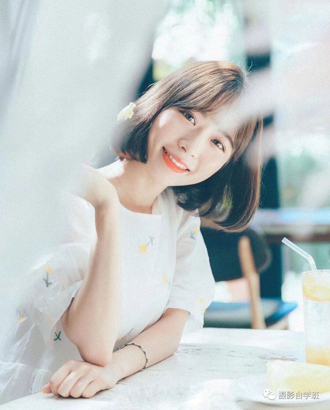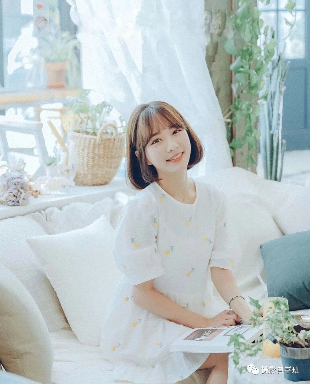 在室内,如果家中的窗帘和周边的家具,都是浅色的,也要穿着浅色的衣服,这样可以让照片看起来,更加淡雅。白色也会显得更加纯净。同一个室内,不同的位置,摆出不同的姿势,像上图这样。或者向下图这样,拍摄时带出虚化前景,就可以在同一场景下,拍出不同的照片了,大大提高出片率。
