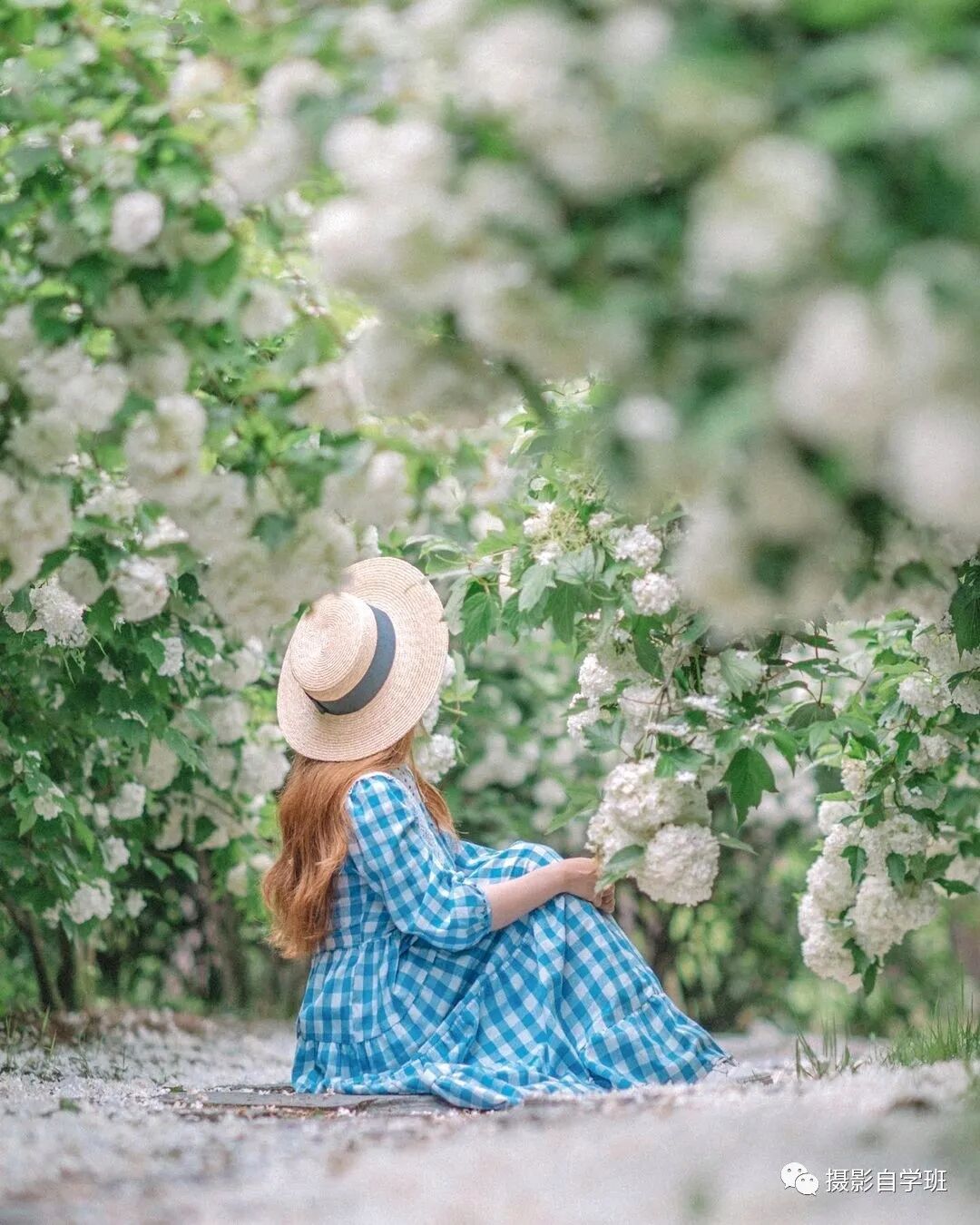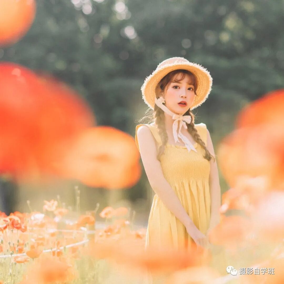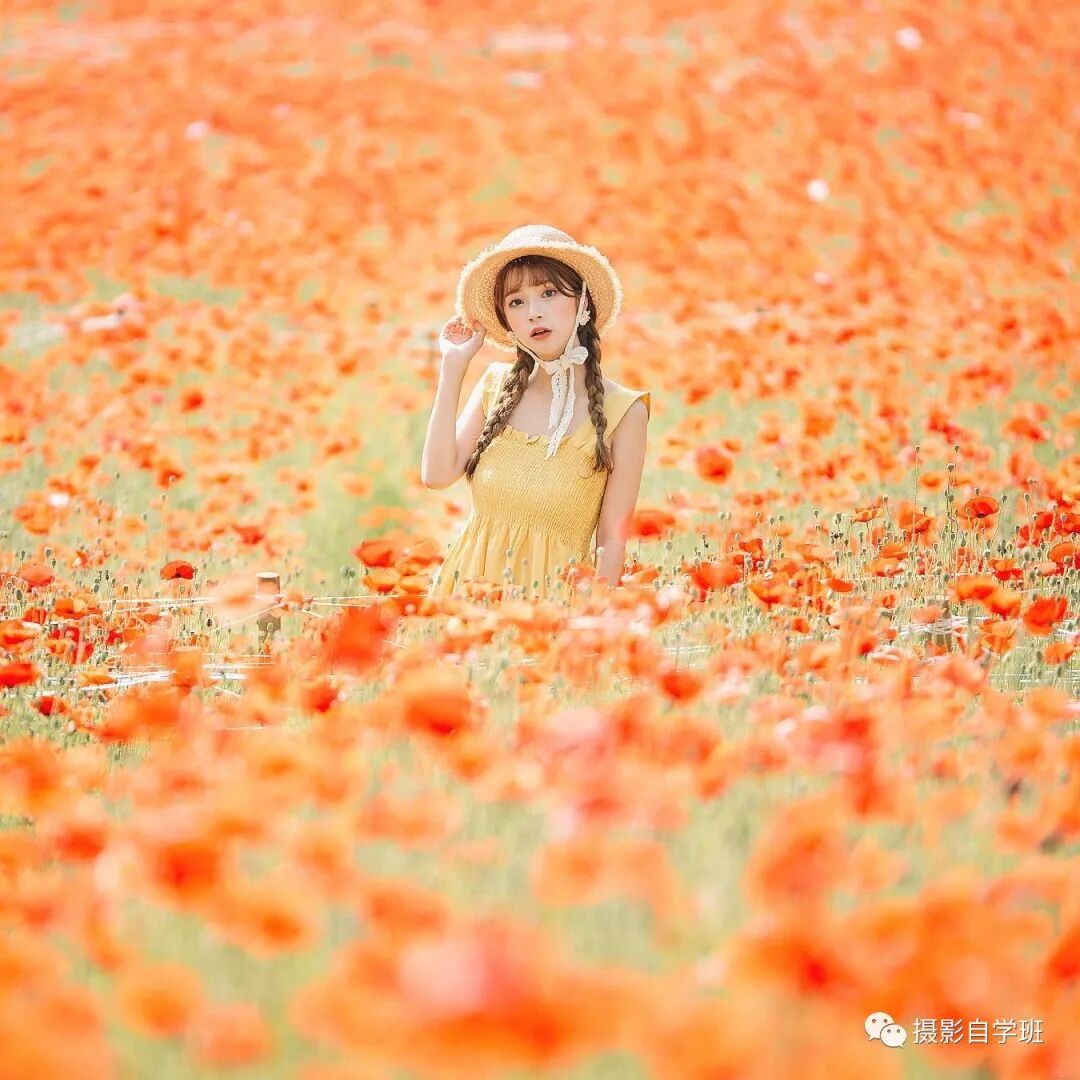 上面这张照片,环境当中的花,很漂亮,人物的衣服颜色,与花朵颜色相接近,也形成了很好的呼应,人也非常美,但是背景上有瑕疵,背景上方有一块黑色的区域,影响了整体的美观,拍摄的时候,摄影师应该站得更高一点,这样就可以让背景相对来说,更加完美,像下图这样。