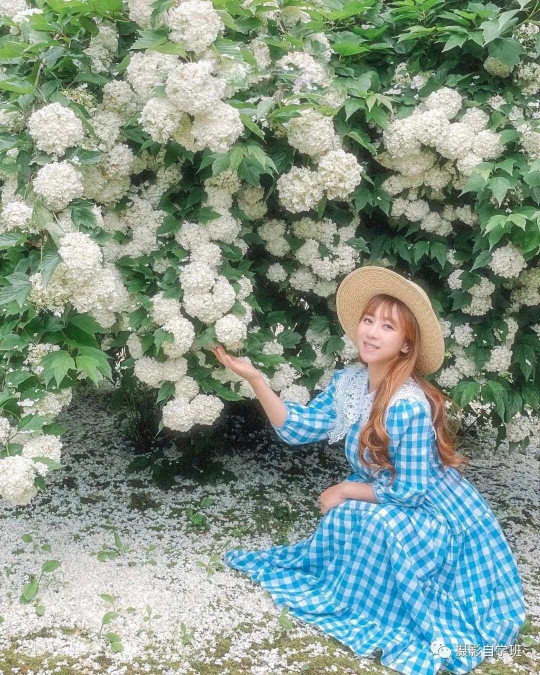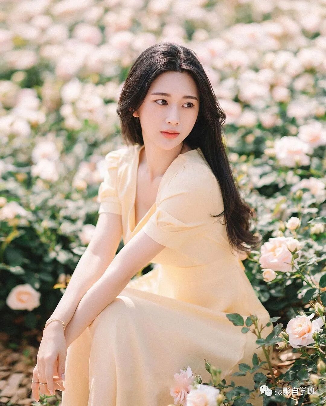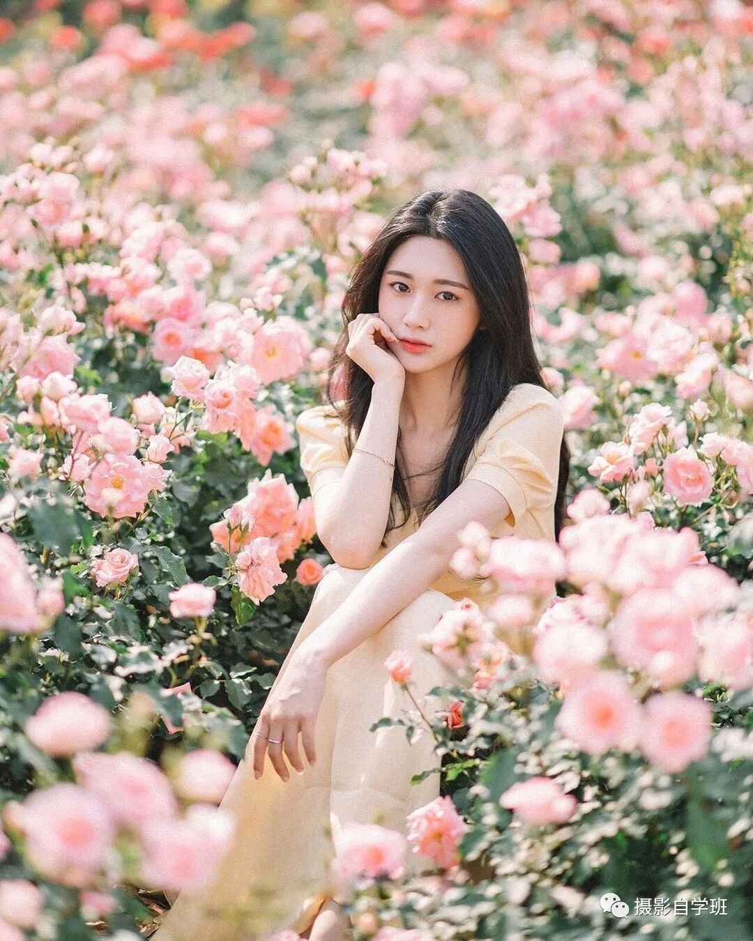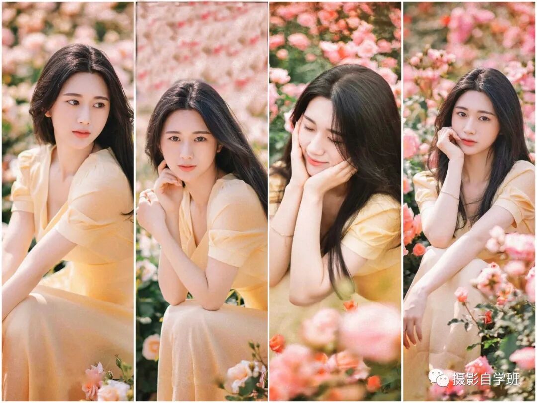 下面就是介绍,在同样的一个场景,怎么能够拍出更多好看的照片呢?这里就需要你的姿势丰富,如果你是摄影师,就需要引导模特,摆出不同的姿势,或者表情。像上面这张照片,不看镜头,手搭在前方,值得你模仿。还可以走到花丛深处,坐在地面,一个手拄着下巴,一个手搭在前方,这种姿势看起来,也非常优雅。