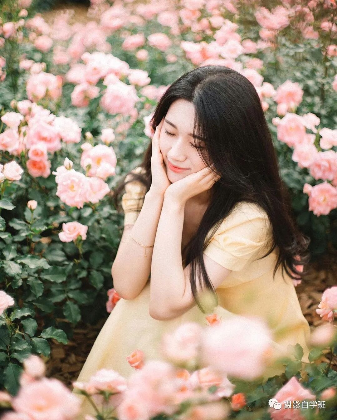 不要忘了闭眼睛,花朵这个环境,和闭眼睛这个表情,非常搭配,显得非常陶醉,可以让画面看起来很恬静。在同一场景下,拍出多张好看的照片,提高出片率的方法,你学会了吗?