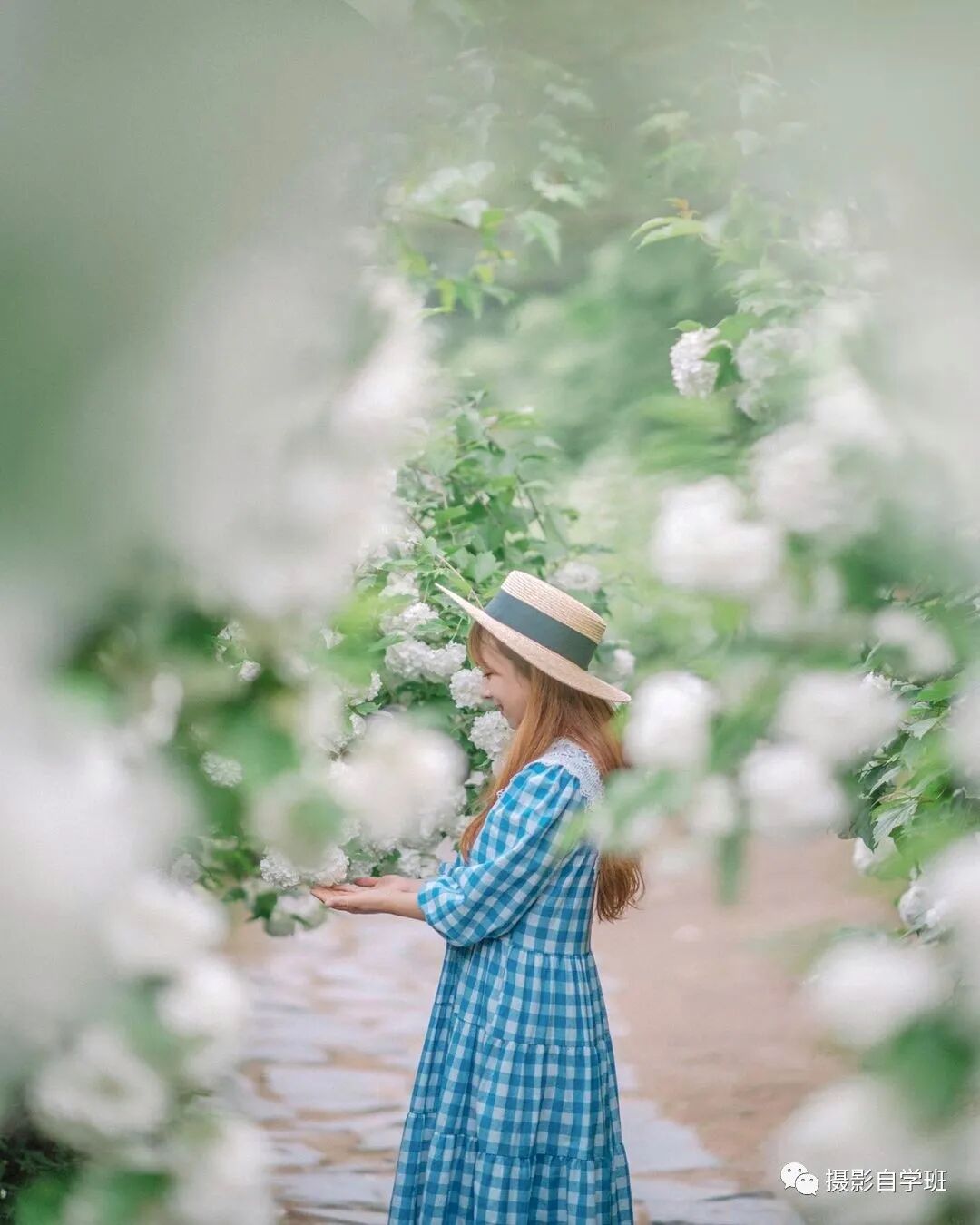可以像上图与下图这样,被拍摄的人要动起来,手抬起来,可以摸着花,或者两个手都放到花枝上,这样有动作看起来就不会僵硬。即使被拍摄的人,盯着镜头看,相对来说,把手抬起来,姿势也会更加自然,不会那么尴尬。