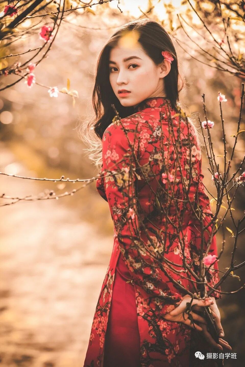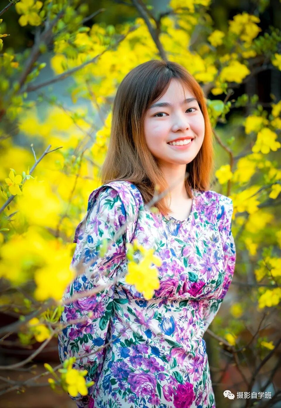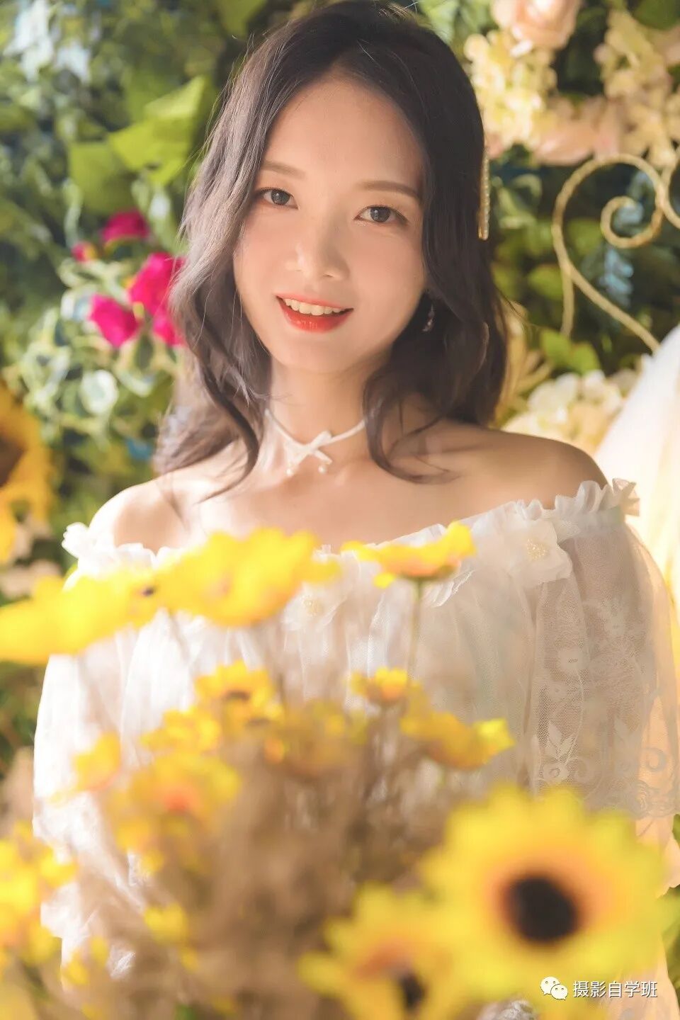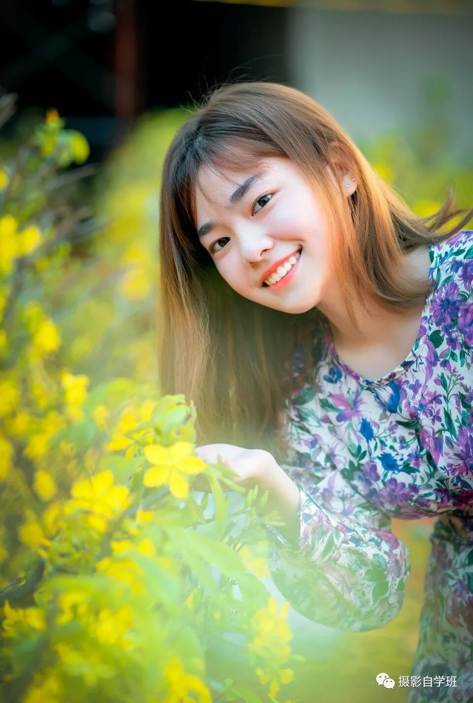 人还可以从一个侧面,把头伸向镜头,手轻抚花朵,同样还是利用花朵在照片前形成虚化。为照片增加朦胧感。