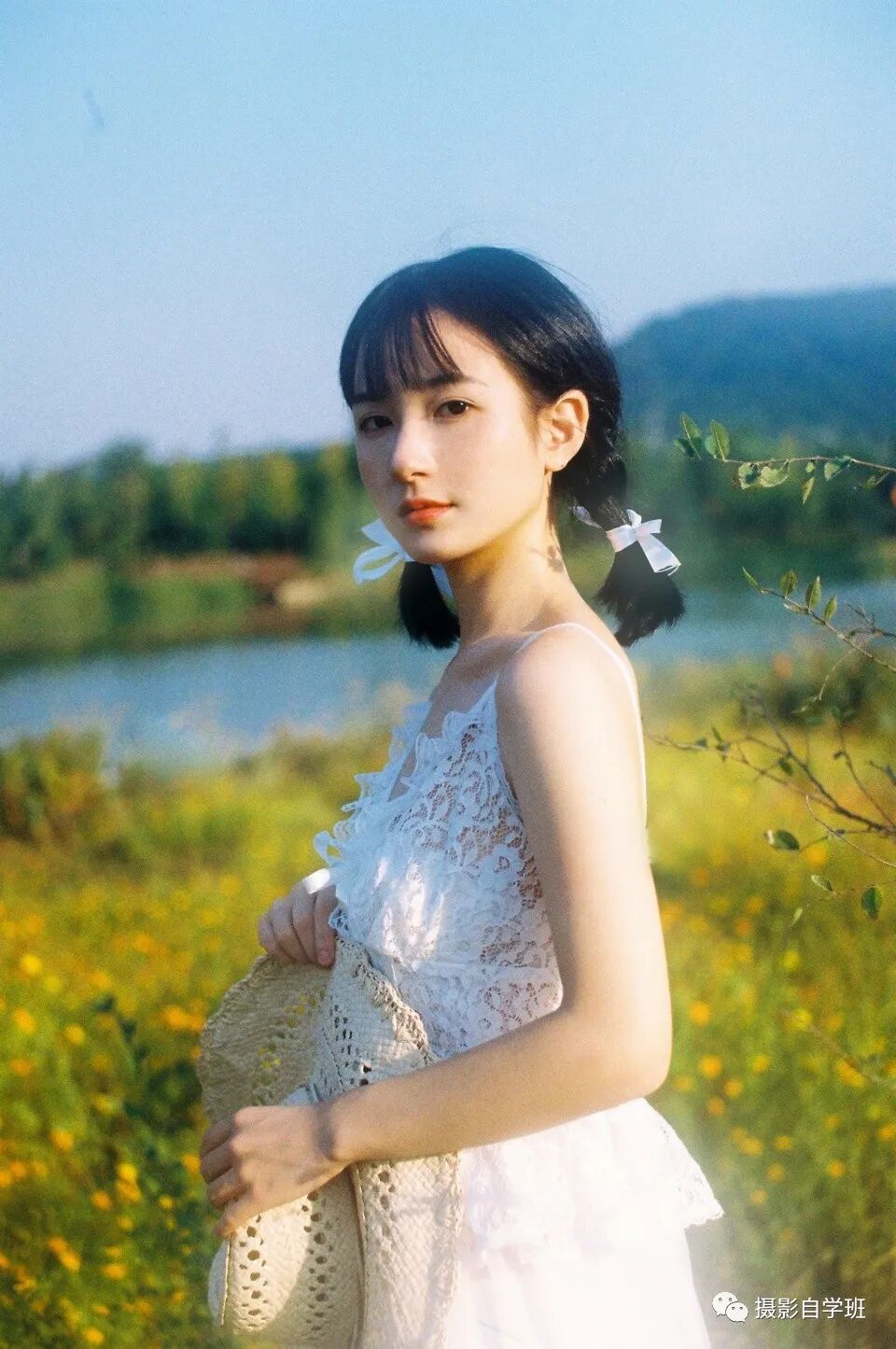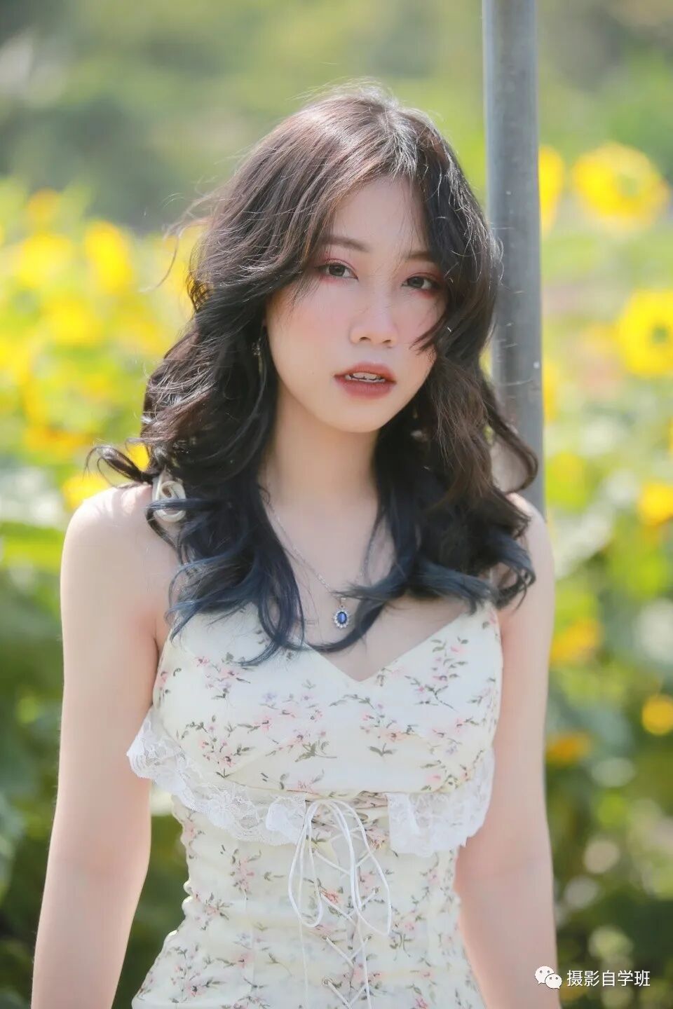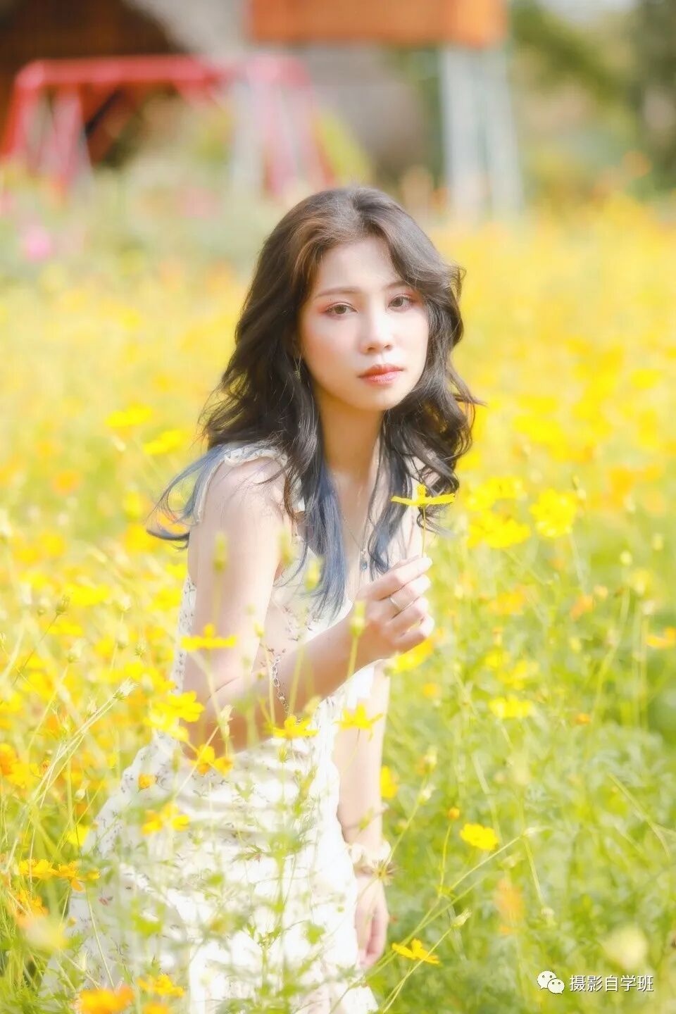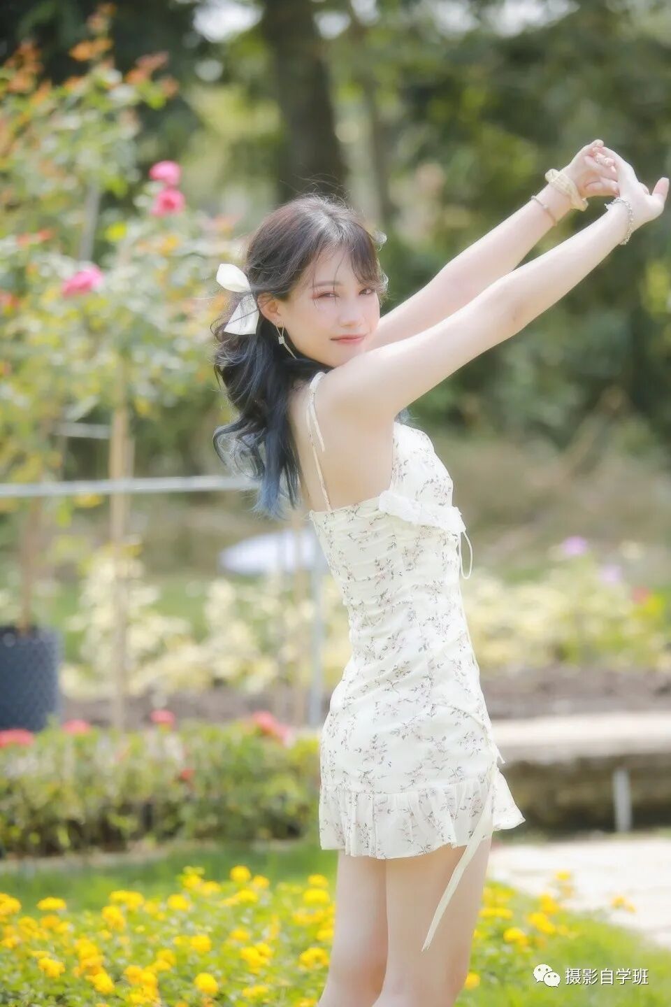 走在花丛当中,头部还可以向下,眼神看地面,如果穿着裙子,可以两手把裙子适当抬起,这个姿势也很不错,同样是需要注意背景的线条,不要像图中这样穿头而过。