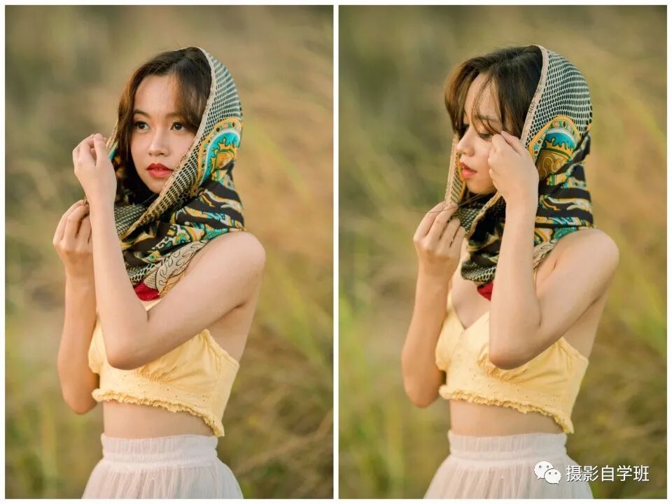 咱可以像上图这样,准备一个头巾围在头上,这样就会让你的姿势丰富起来,可以用手扶头巾,也可以用手撩头发,姿势都非常优美。