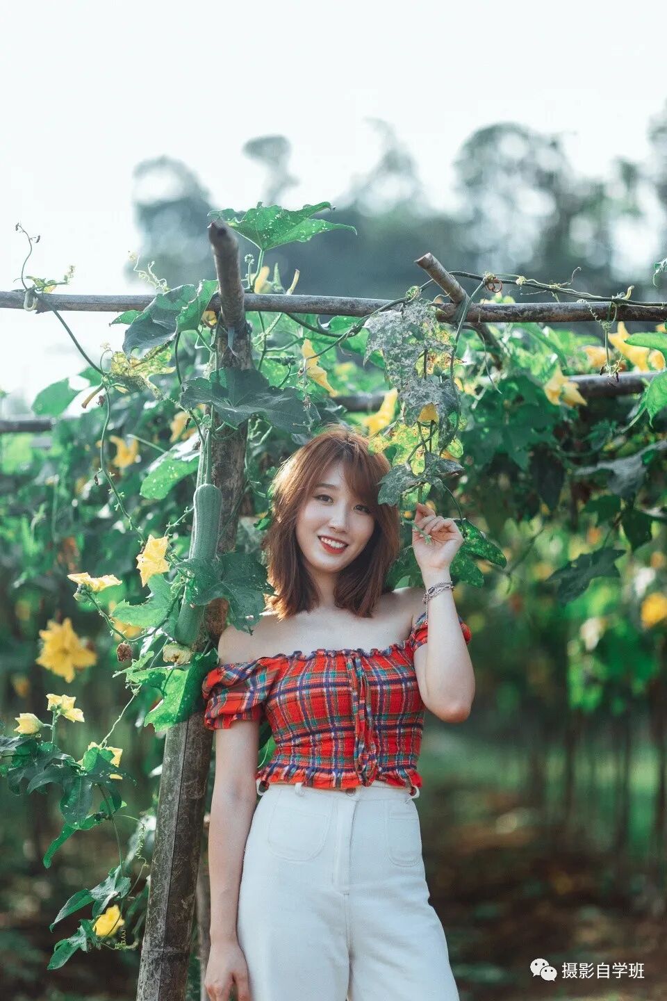 上面这张照片,是利用植物摆姿势的错误事例,人靠在架子上,手只是抬起来,这样的姿势,平常又一般。而我们完全可以利用植物遮挡住镜头,让人在离植物远的地方,做其他事情,镜头在不经意间,拍摄到画面中的人,前景的植物就会形成很好的虚化,照片的层次感,远处的人因为没有注意镜头,是被抓拍的姿势,也更自然。
