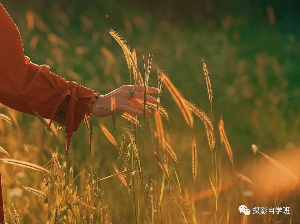 秋天如果有机会到室外,可以在草地当中拍摄下图这种的照片,手轻抚草,注意把手臂尽量打开一些,拍摄时只戴上手臂,不带上人,画面更有神秘感,同时注意逆光拍照,逆向过来的光线可以让草形成轮廓,照片的质感更好。
