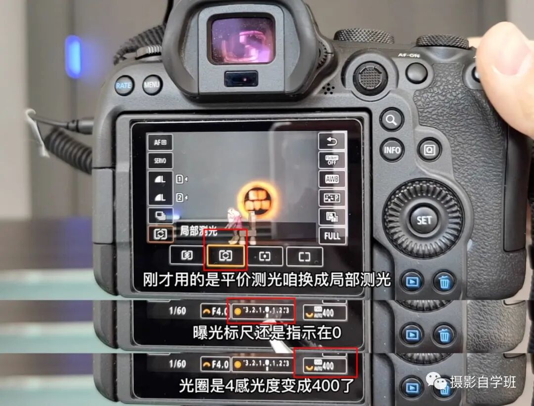 我们把测光模式调成局部测光的时候,发现曝光标尺依然指示在0的位置,但是参数有所变化了,光圈4,快门速度1/60s,感光度在400了。所以相机模式在半自动的情况下,改变测光模式,为了均衡曝光值,曝光标尺虽说在0的位置,但其他数值是有所改变的。