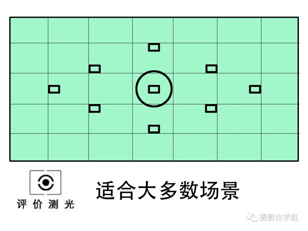 是对全画面进行测光。简单的来说,就是将画面分成很多个小区域,相机对每个小区域的亮暗进行计算评价,然后得到一个明暗的平均值,这就是我们对整个画面的测光结果。它的好处是可以均衡画面曝光,不会出现高光过曝的情况。