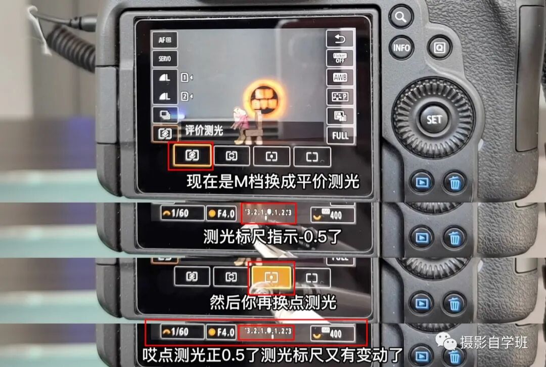 来看下图,在测光模式变成评价测光之后,发现曝光标尺的数值在-0.5的位置,再换成点测光之后,测光标尺又在0.5的位置了,所以在手动档(M档)的情况下,所有参数不变,改变测光模式,曝光也会有所改变,然后根据自己所需,调整曝光参数。