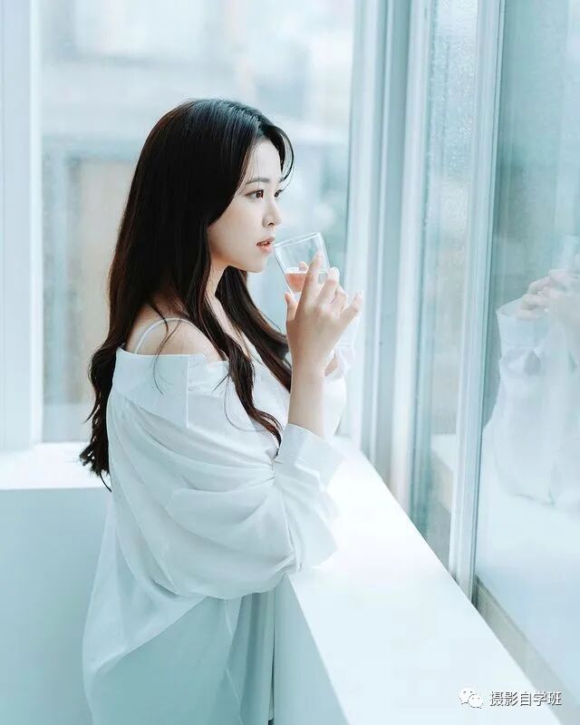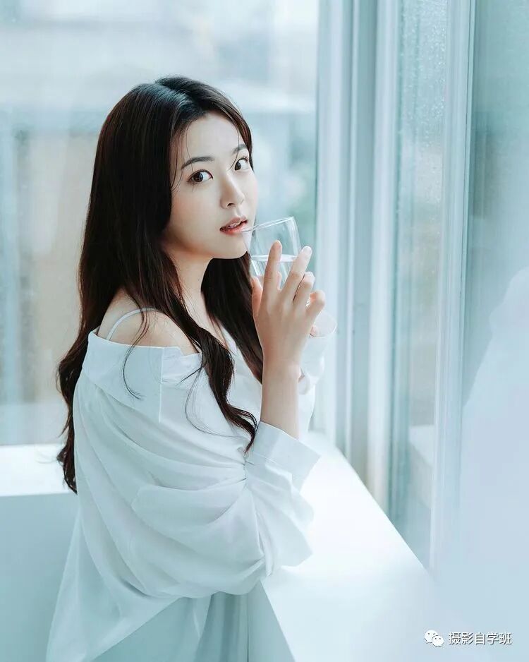 在家中拍摄,如果周围的环境墙体,都是白色的,被拍摄的人,也要像上图一样白色的衣服,拿一个透明的水杯,这样可以让画面,整体看起来更加干净。把手臂放在窗台上,一张看窗外,一张看镜头,同样的一个姿势,能拍出两种不同的效果,都很自然。