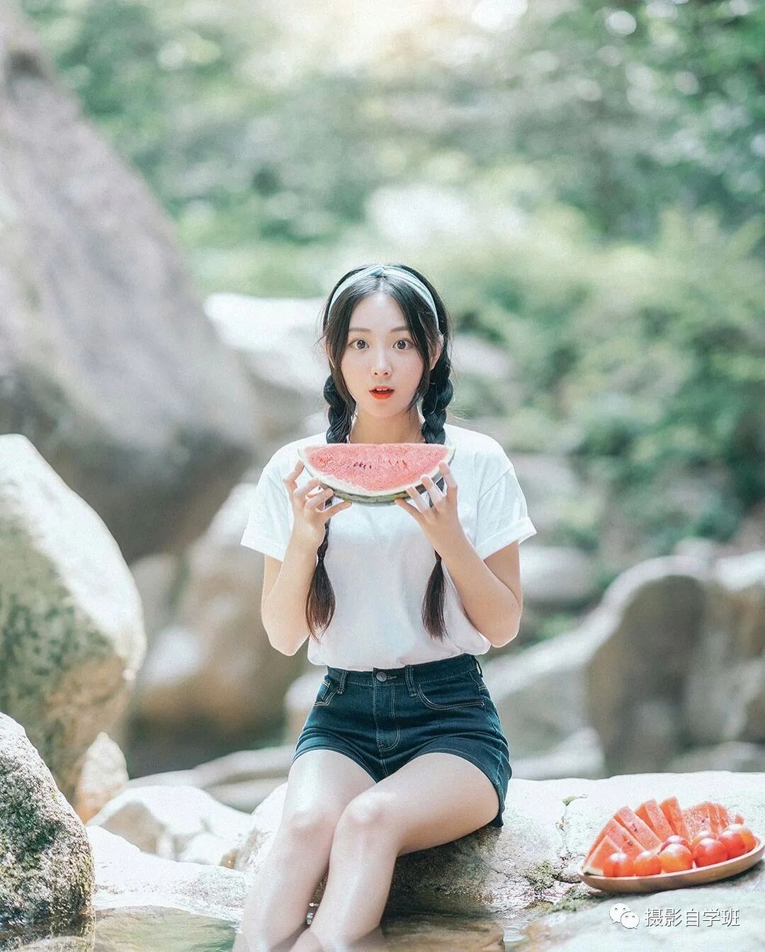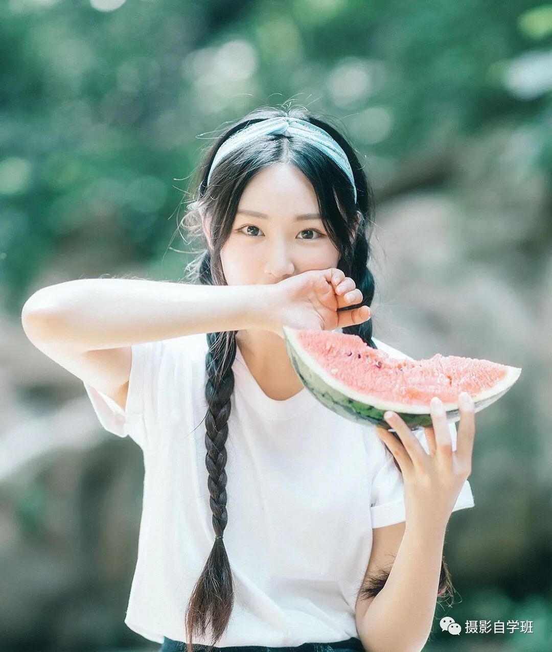 在夏天的时候,人们最常吃的水果,就是西瓜,可以利用西瓜,摆出一些自然的姿势,像上图一样,一个手拿西瓜,另外一个手做出擦嘴的动作。或者像下图一样,两个手捧着一个西瓜,做出一些惊恐的表情,可以增加照片的趣味。在摆姿势当中,表情也很重要,不要忽略这一点。