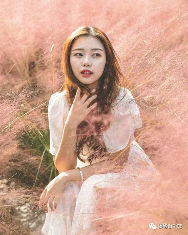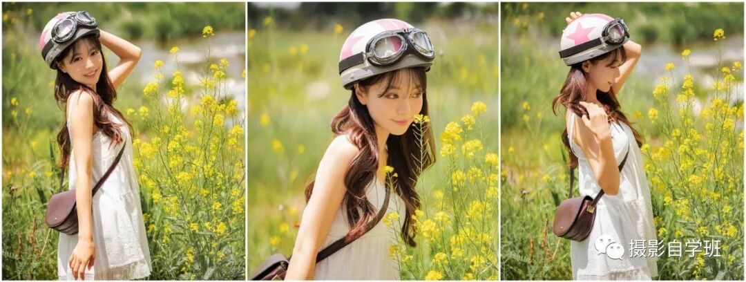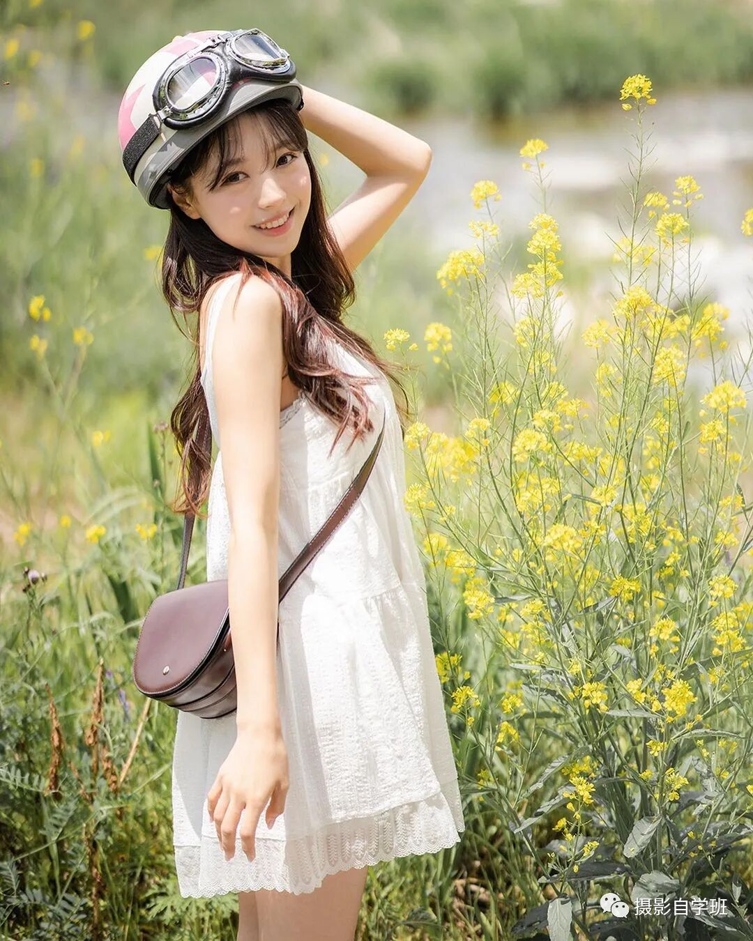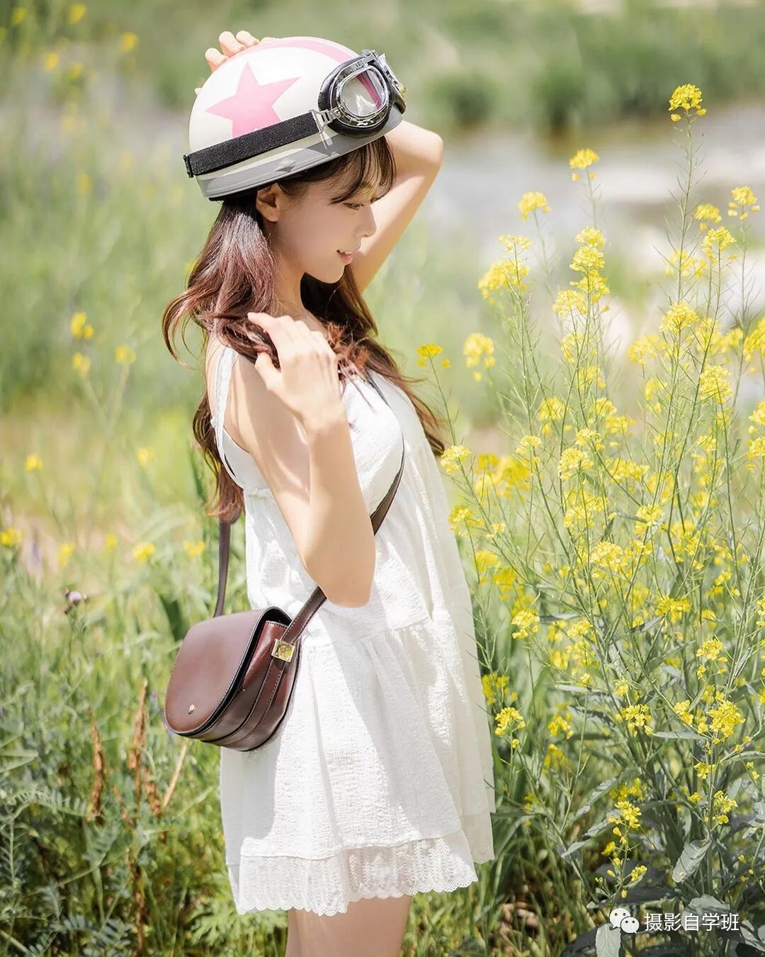 自然的动作,看起来就是不经意的,像上图这种路边的小花,随处都能够遇到,让被拍摄的人,走到花旁。摄影师引导她扶一下头盔,另外一只手,扶一下头发。自然的姿势,就出来了。如果想体现活泼,该怎么办呢?