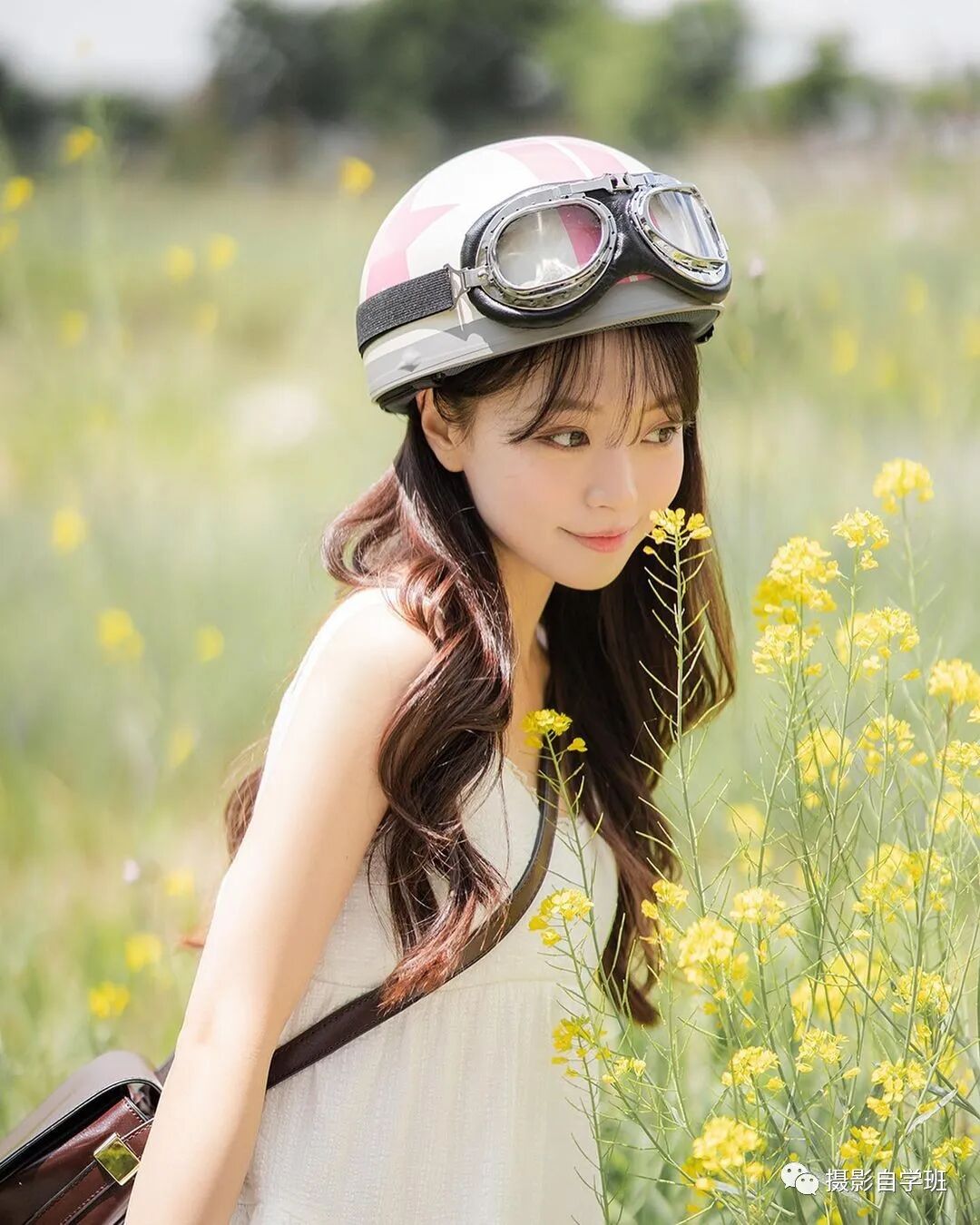 可以让她把距离镜头近的手放下,另外一只手,还是在头盔上,转过头来,一个回眸的姿势,就能够显得更加活泼。还可以引导她,闻一闻前面的花朵,这里也需要模特的配合,有闻花的姿势,就已经显得很活泼,但眼神是关键。