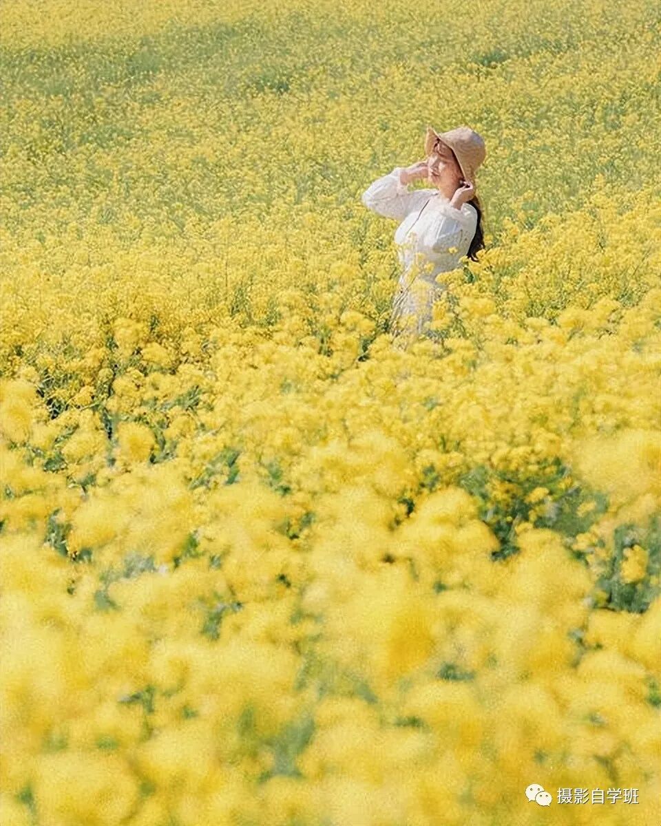 摆姿势,不要刻意,有的朋友,可能就是喜欢拍一些活泼一点,搞怪一点的姿势。并不矮的人,蜷缩成一团,堆在花丛中间,好像小矮人一样,这样摆姿势时,脸上可以有自然的笑容,这样的笑容,就会给照片加分。搞怪的姿势,可以为你的照片增加趣味。还可以拍一些优雅的姿势,像下图一样站在花丛中,两个手扶着帽檐儿,脸冲着有光的方向。