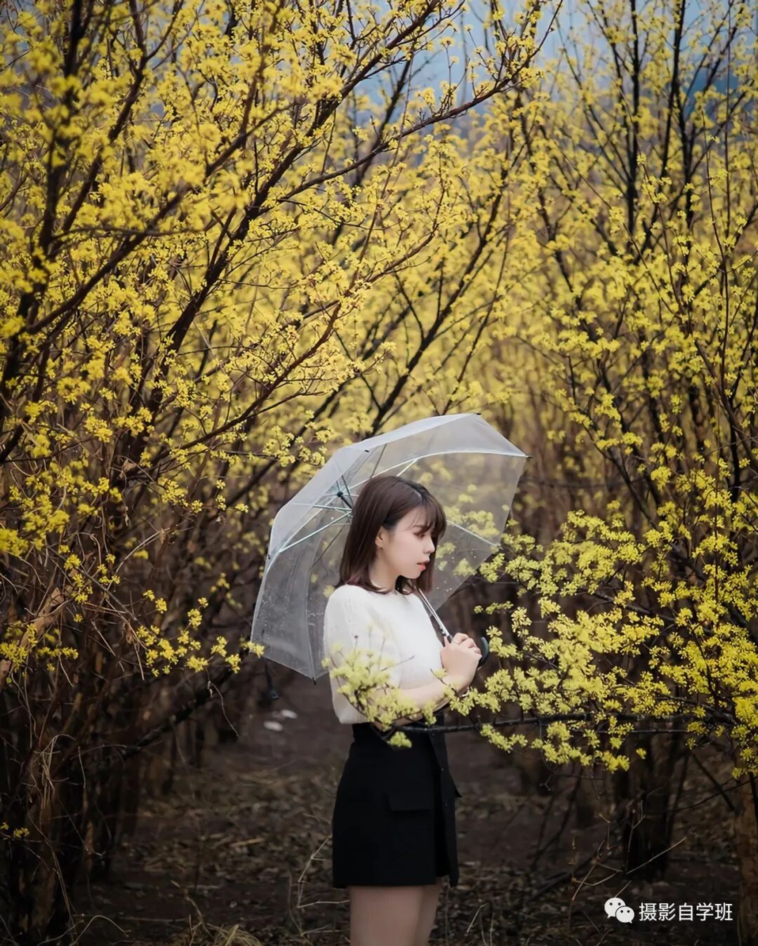 上面这张照片,人物的姿势非常不好看,并且这个拍摄角度,以及人物头部的这个方向,让鼻孔看起来有些大,两个手臂抬到脑袋上,让胳膊看起来很粗,人显得很壮。如果在摆姿势的时候,没有什么姿势可摆,最好的办法,就是拿着一个道具,像下图这样准备一把伞,就能够帮你,摆出无穷的姿势。