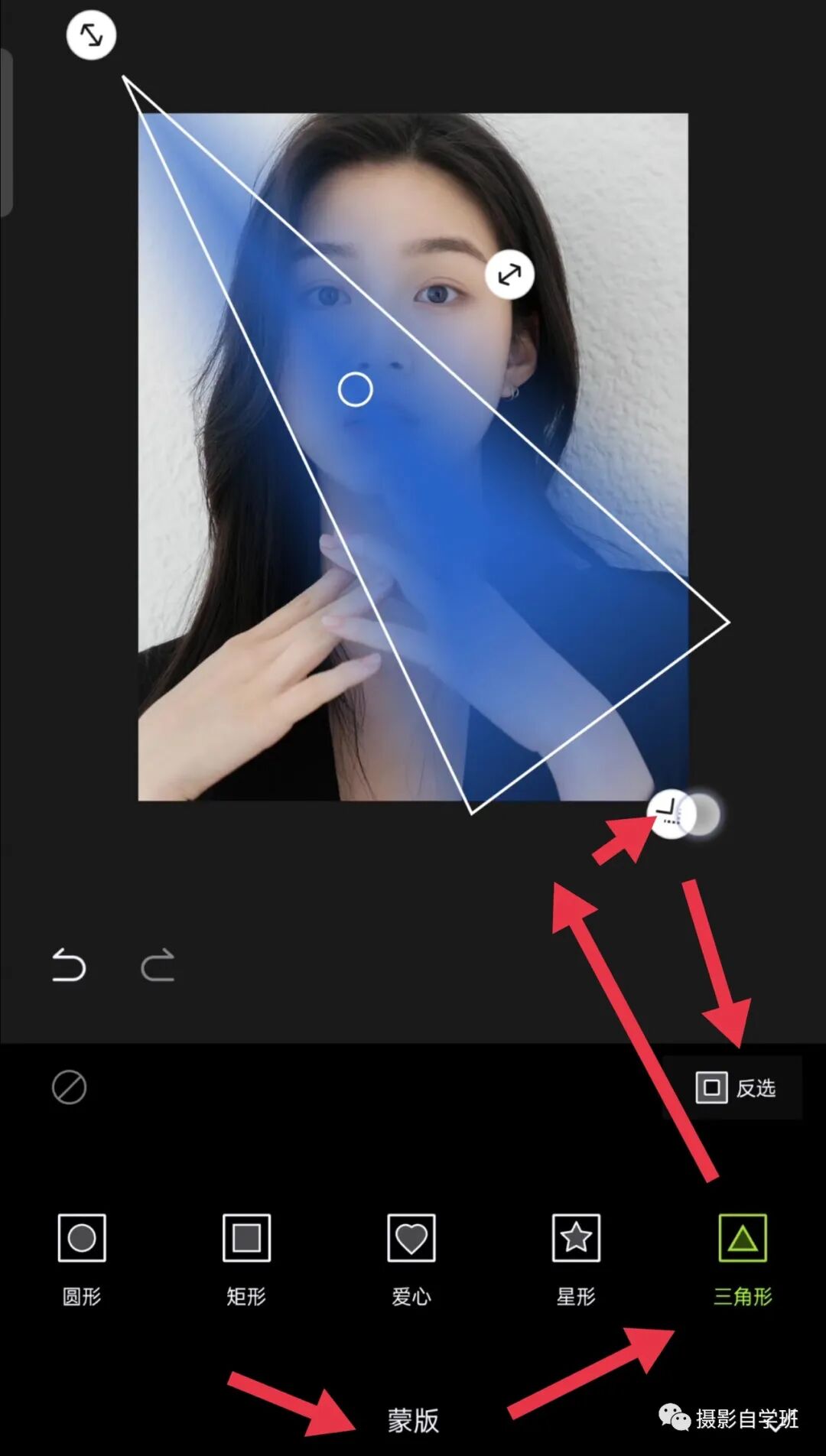 再用软件打开原图,导入刚才那张纯色背景,把纯色背景放大到,和原图一样大。然后点击蒙版,在蒙版当中,找到三角形。调整蓝色背景为三角形,把它的一个角拽到左上角,另外两个角,在右下角,调整到合适大小,以及合适的位置。